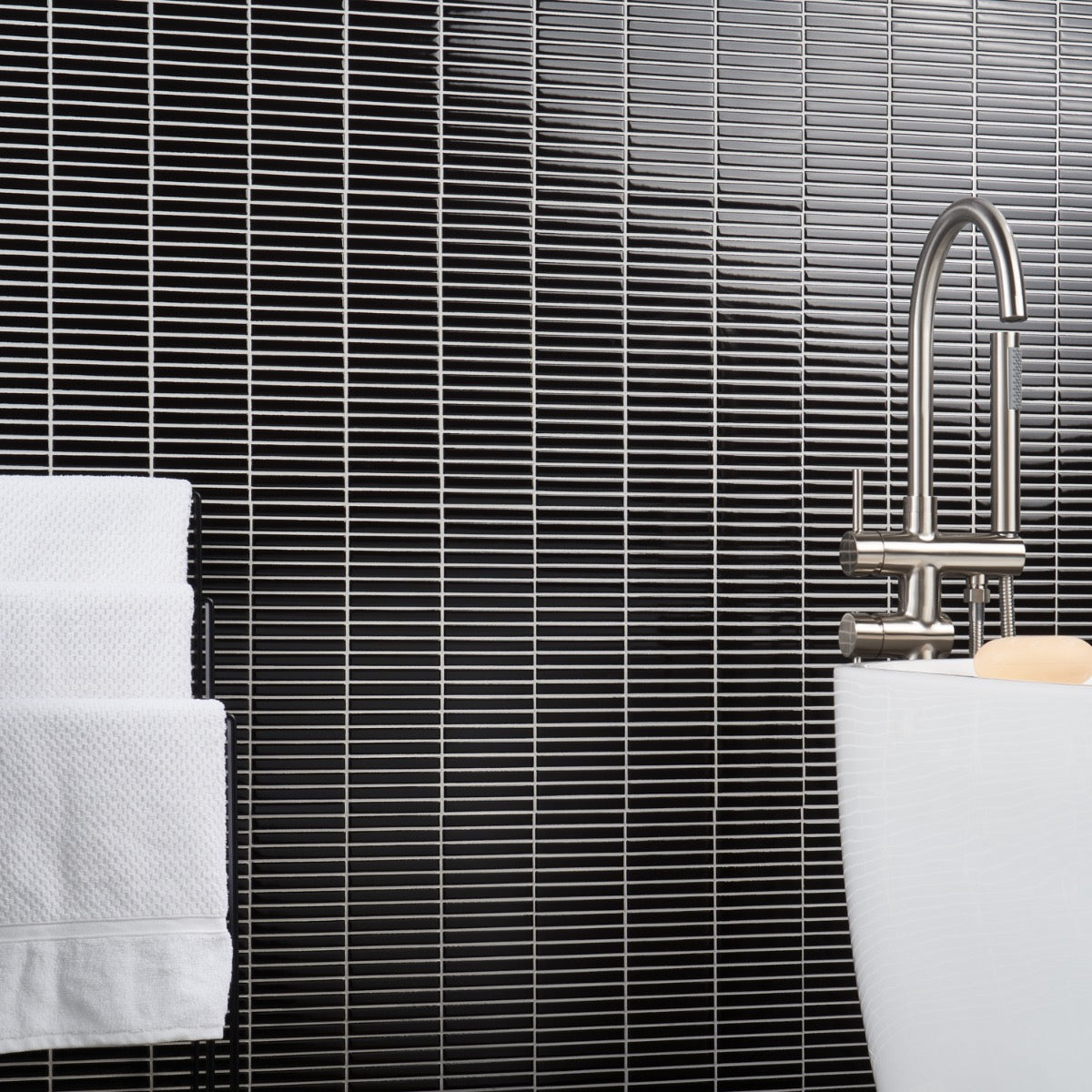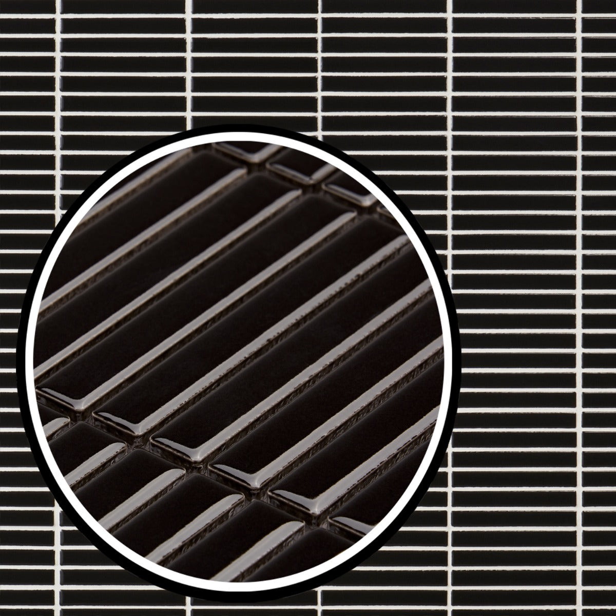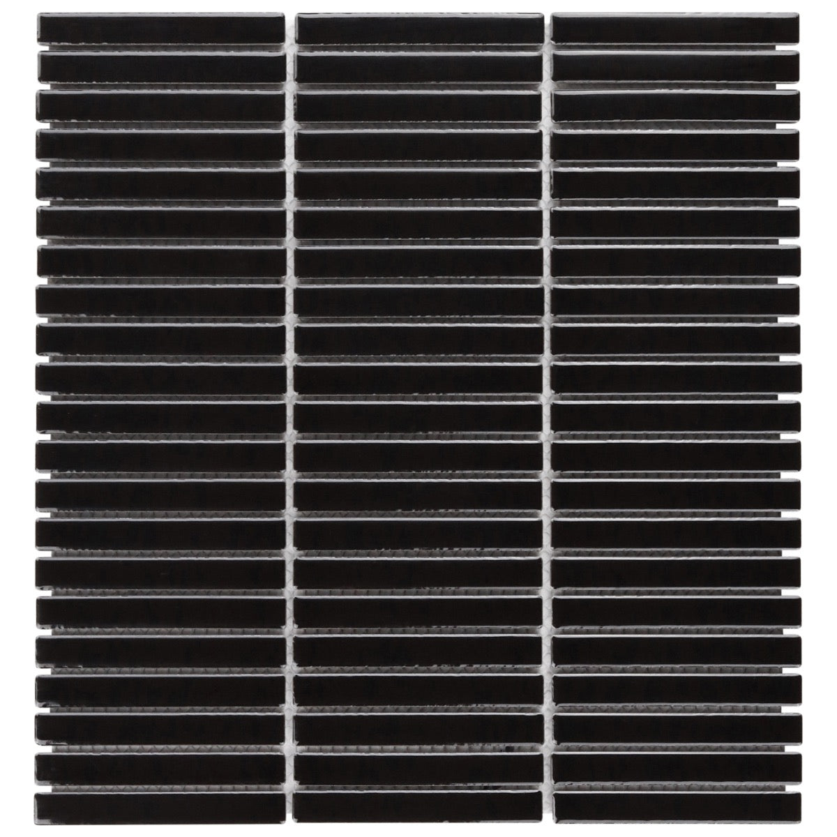 Kai Black Glossy Porcelain Mosaic Tile - 1x4" Tri-Stacked