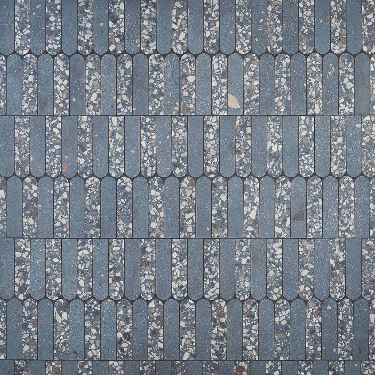 The Kobe Fin Ocean Blue Terrazzo Look Matte Porcelain Mosaic Tile combines modern 3-D printing technology with timeless terrazzo design, offering exceptional durability and a seamless look for indoor and outdoor applications.