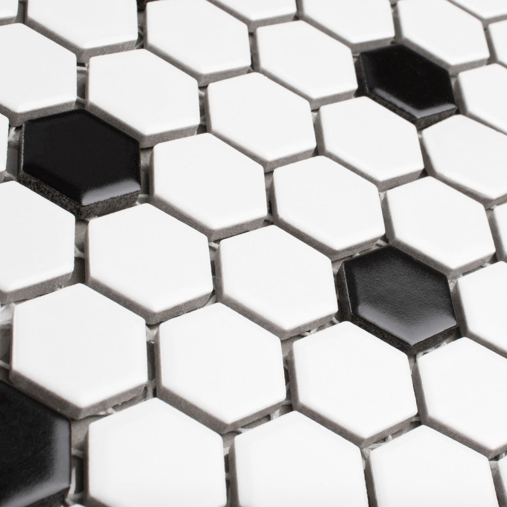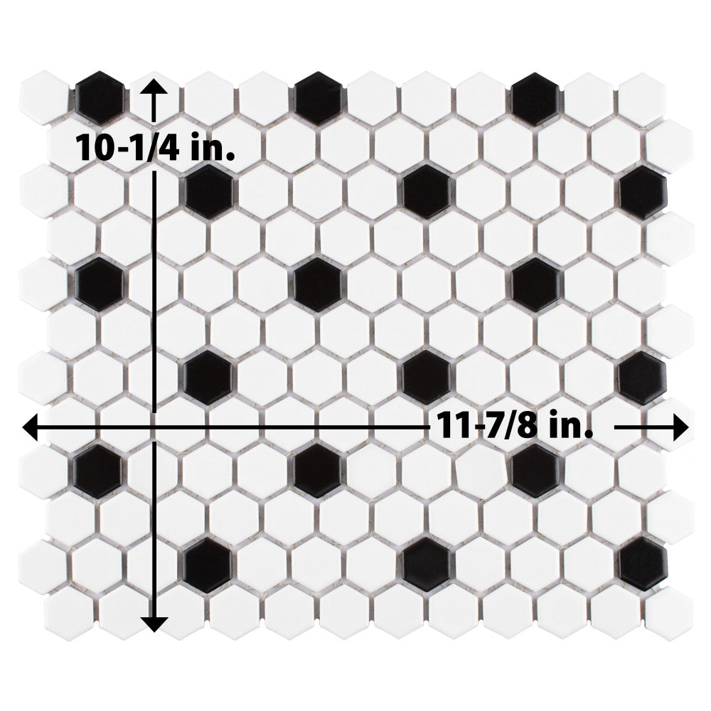 Classic white-and-black hex mosaic made of durable porcelain with a smooth matte finish. Impervious and frost-resistant for versatile floor and wall installations indoors or outdoors. Mesh-mounted sheet measures 11-7/8 x 10-1/4 in. for easy placement and vintage charm.