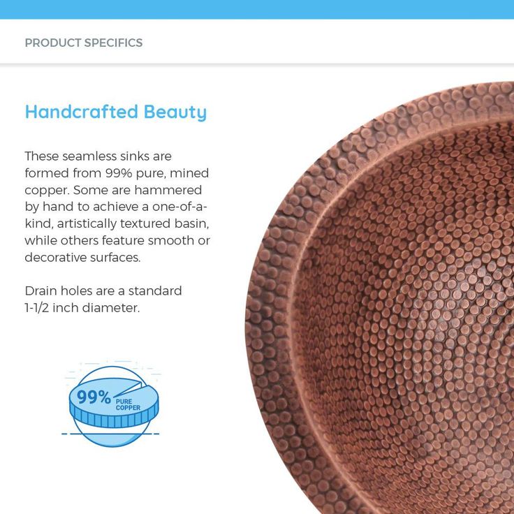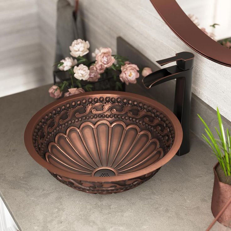 An impressed scallop pattern of ornamental shapes and dots repeats around the interior and exterior of this copper vessel with its ever-changing patina. A special feature of this design is that it can be mounted under, over, or on the counter as a vessel sink. With an overall measurement of 16-3/8 in. x 16-3/8 in. x 6 in., it will require a minimum-width cabinet of 18 in. The 731-ABR, single-handle, vessel faucet reaches a height of 12-1/4 in. and features a classic trough-style spout with a 4 in. reach. Its sleek lines gradually widen and contract to create a stunning design statement. The single handle has a flat top with an inverse curve below to mimic the spout design; and it easily sets just the right water flow and temperature. Ceramic disc cartridges assure long-term, dependable operation, and a beautiful antique bronze finish completes its distinctive appearance. The faucet is constructed without lead and is compliant with NSF (National Sanitation Foundation) standards, the Safe Drinking Water Act, the cUPC (Uniform Plumbing Code of the United States and Canada), the ADA (American Disabilities Act) and carries the EPAs WaterSense label. Additionally, a grid drain (gd) is included, which allows water to pass through while catching solid debris with its attractive antique bronze cap.