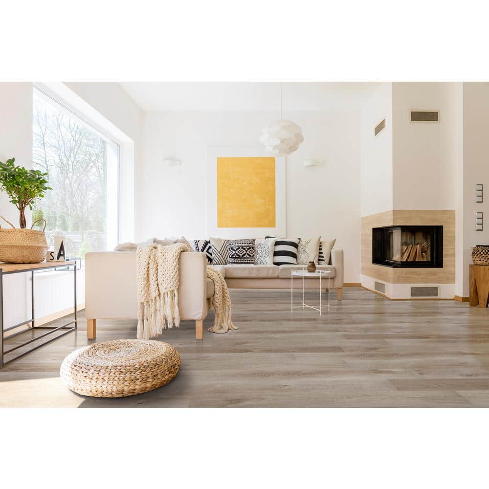 - Wood-Look Design: Mystic Gray colorway pairs with coordinating luxury vinyl plank for a cohesive look