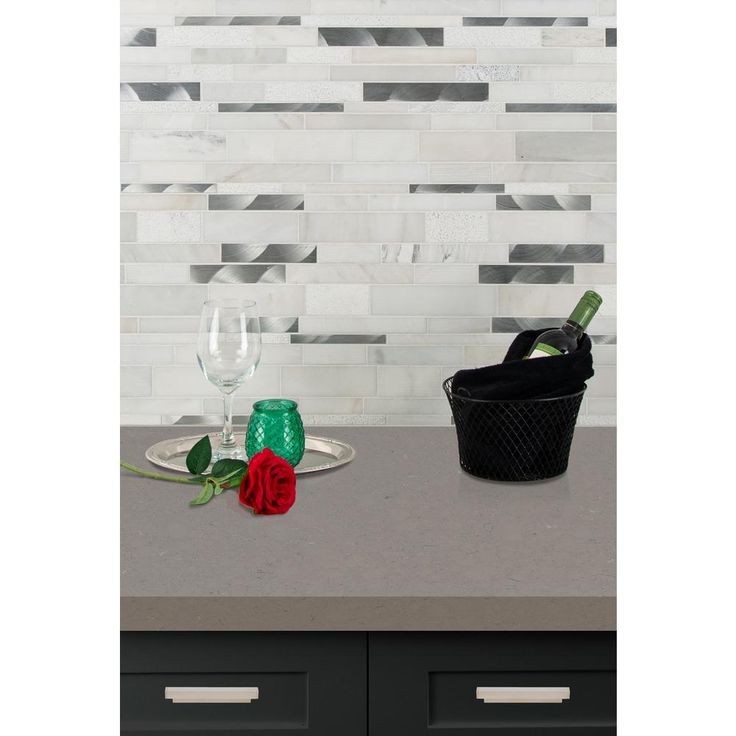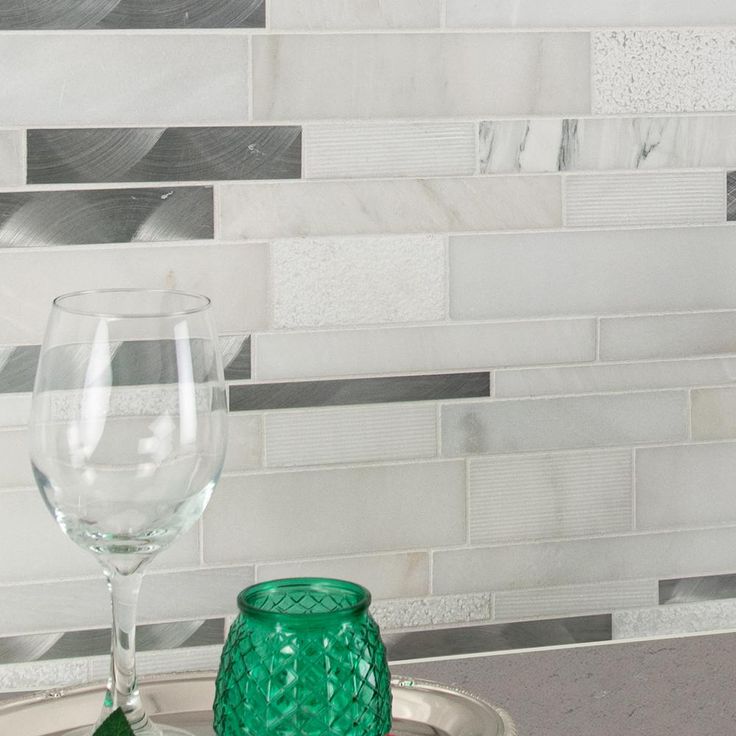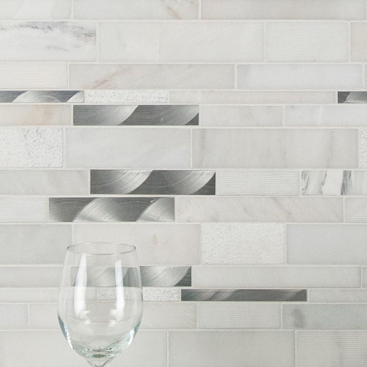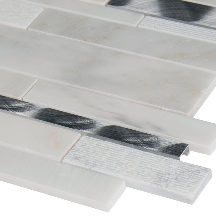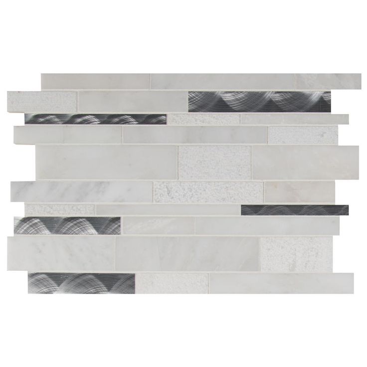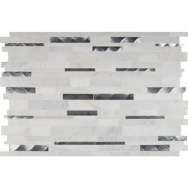 Enhance your home's walls or countertops with this Moderno Blanco interlocking metal-stone mosaic wall tile. Crafted with a flat edge and white hue, these trendy tiles feature various finishes, as natural stone lack uniformity. They add distinction to kitchen backsplashes, bathroom showers or accent walls. The tiles are arranged on a 12 in. x 12 in. mesh sheet for easy installation. Install with a penetrating sealer. It's normal maintenance to refill the voids between the seams of the stones.