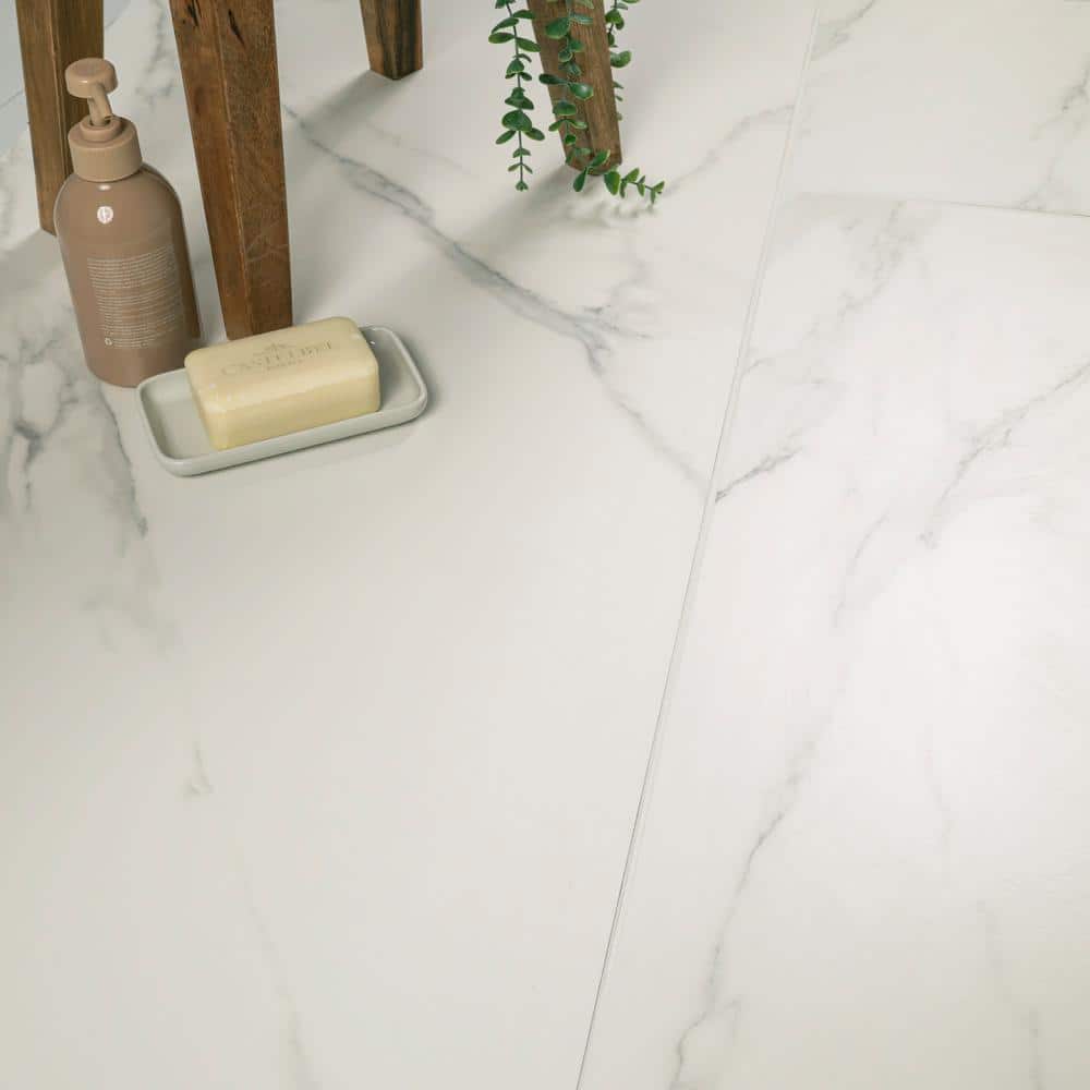 Large-format matte porcelain tile with a refined white marble look and soft gray veining for floors and walls. Waterproof, frost resistant, and rectified for minimal grout lines—ideal for kitchens, baths, showers, and feature walls.