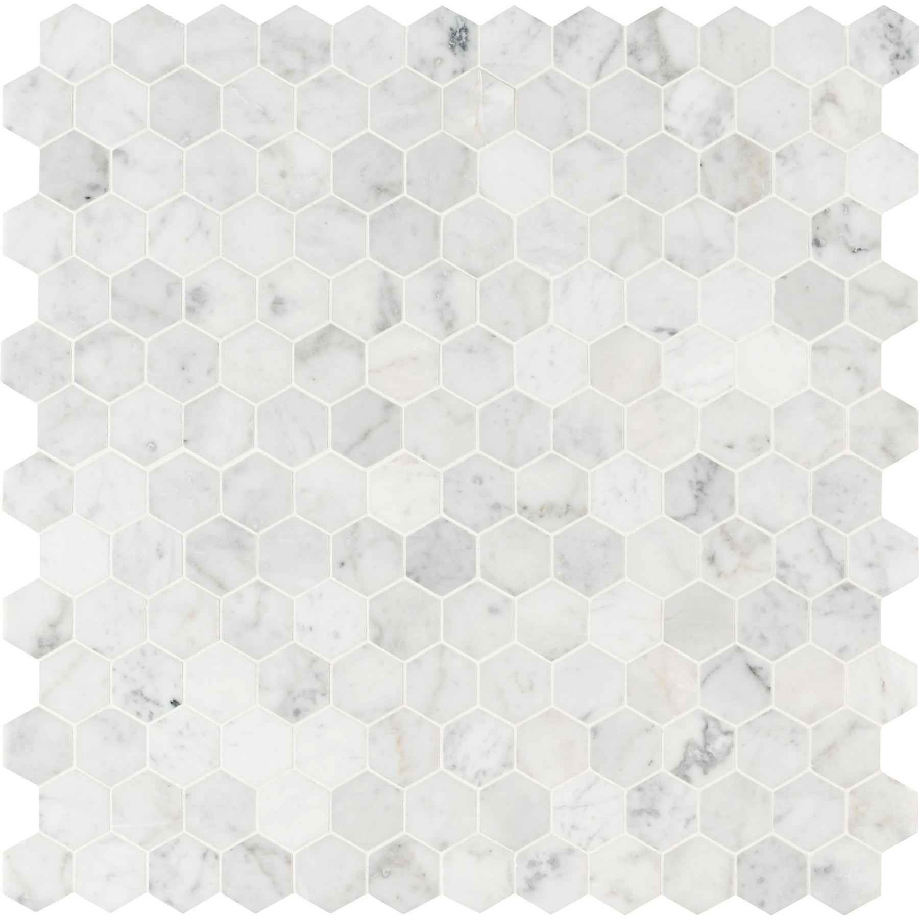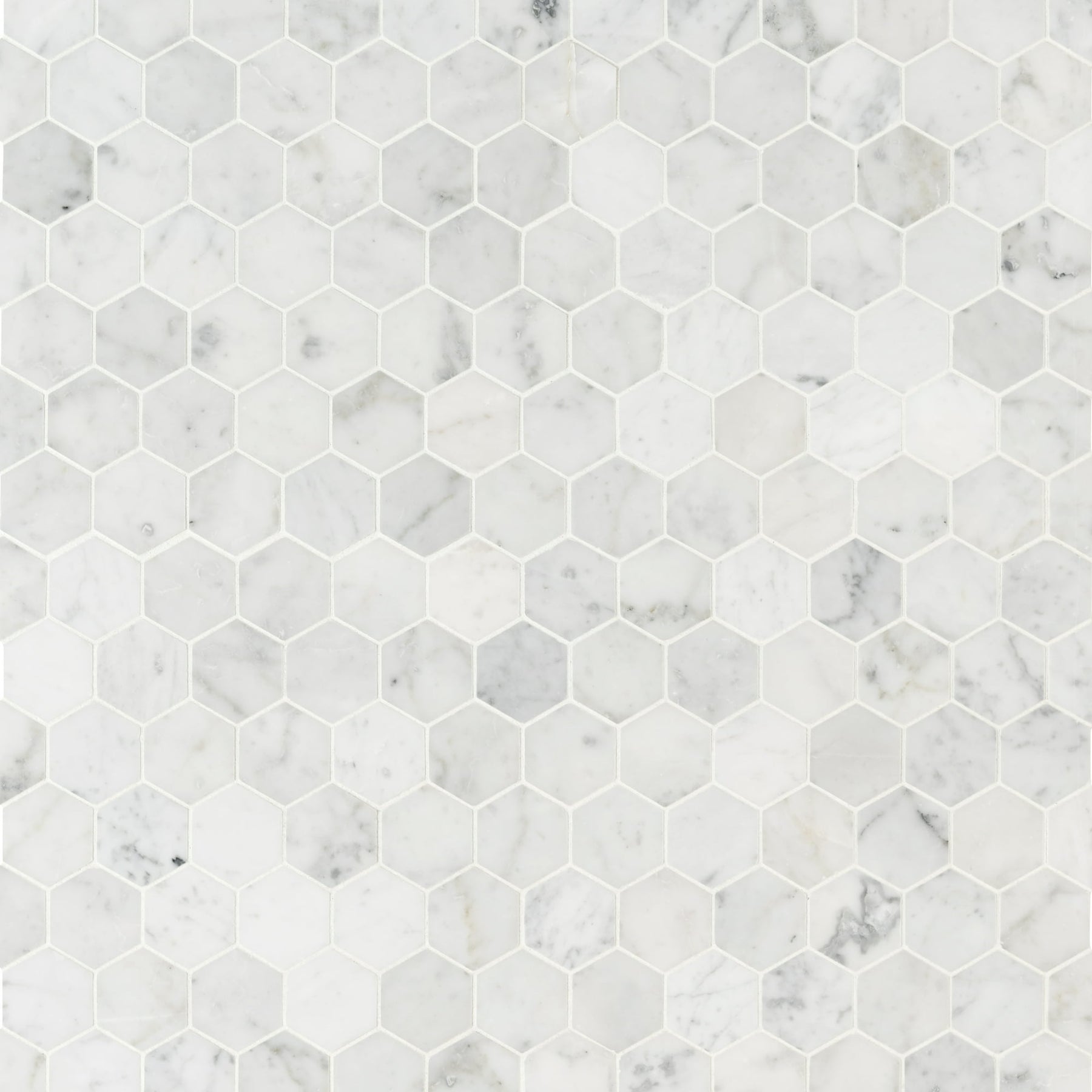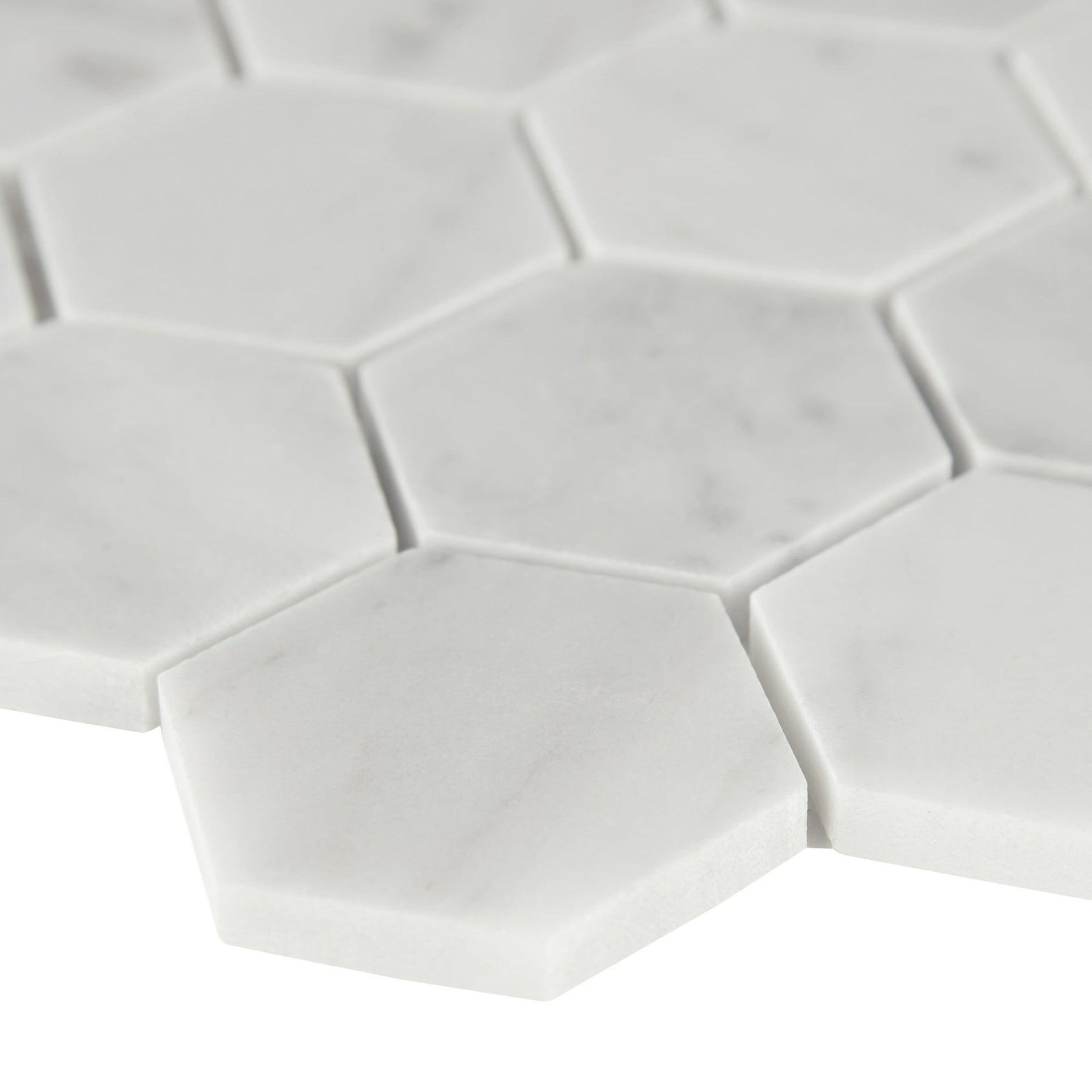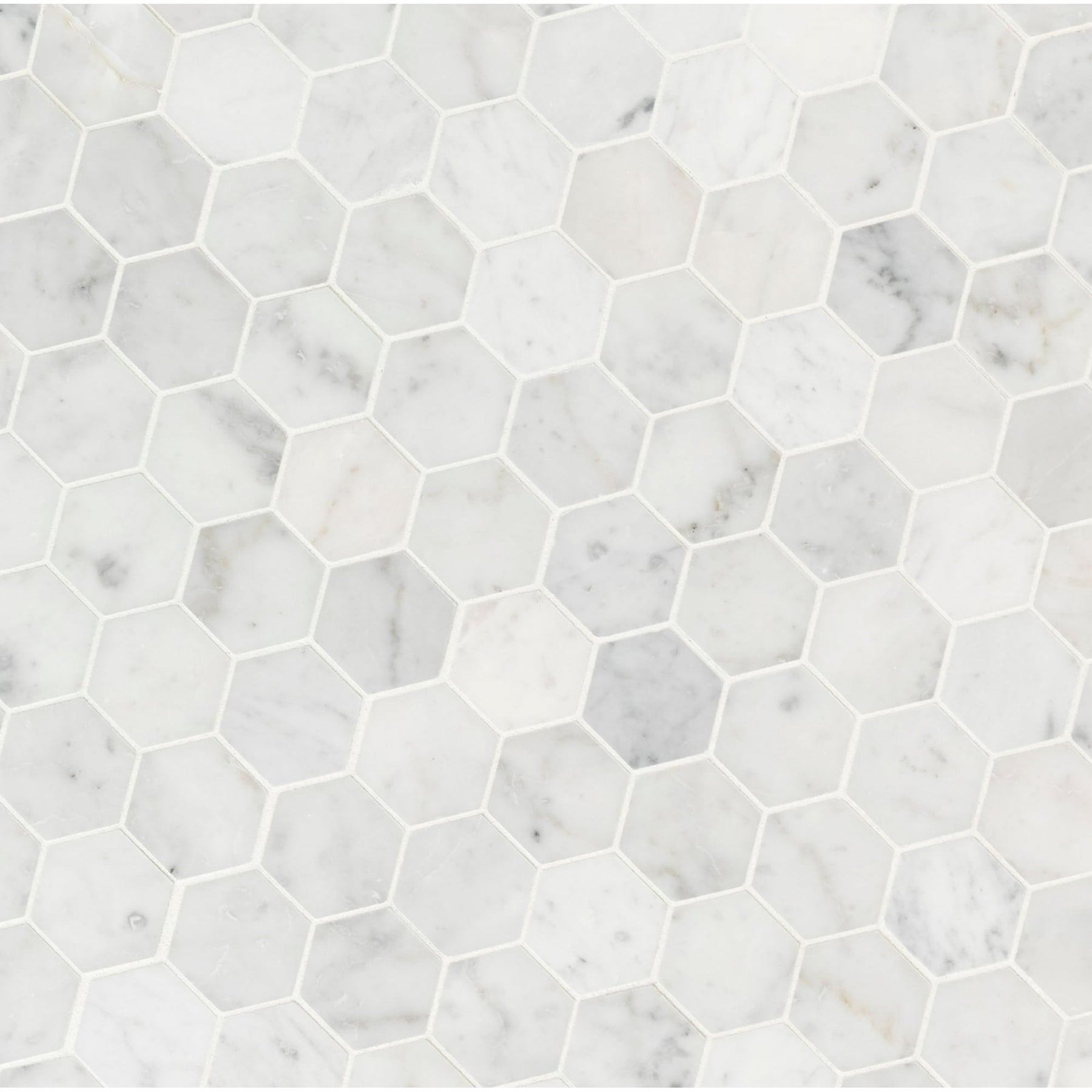 Elegant Carrara White marble mosaic featuring 2-inch hexagon pieces on a 12 x 12 in. mesh sheet for easy installation. The honed, medium-sheen finish and natural tonal variation create a timeless pattern ideal for kitchens, baths, and feature walls.
