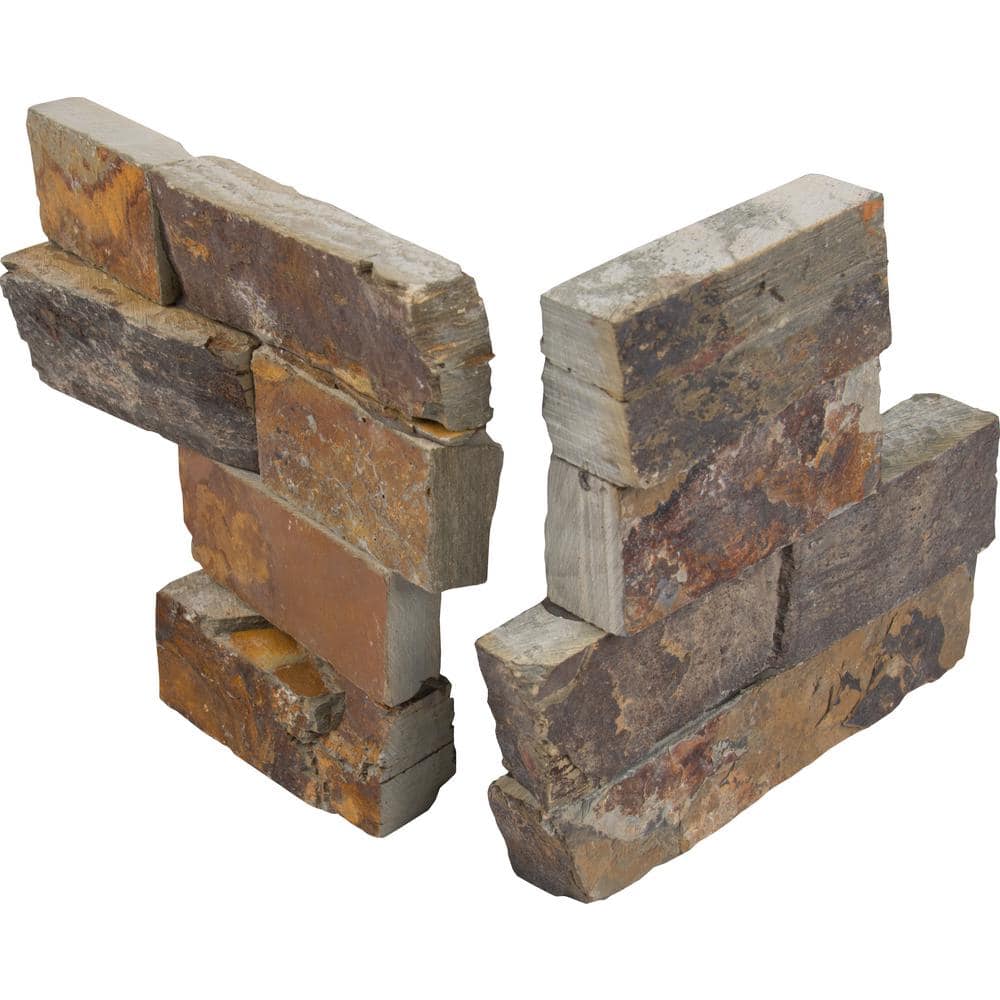 Finish corners cleanly with this MSI California Gold ledger corner tile set. Crafted from natural splitface slate, these 6 in. x 6 in. pieces interlock to form outside corners and coordinate with California Gold ledger panels for a seamless look indoors or out.