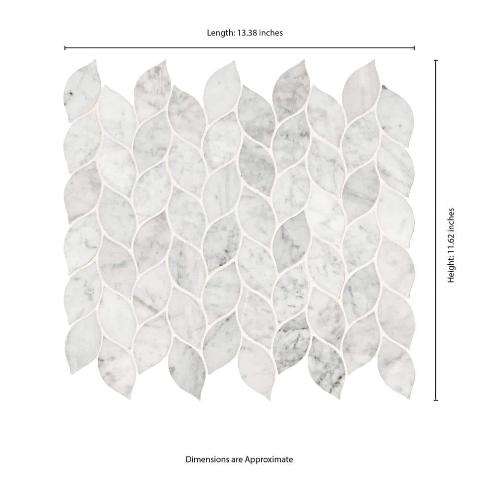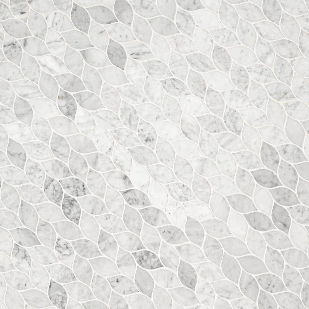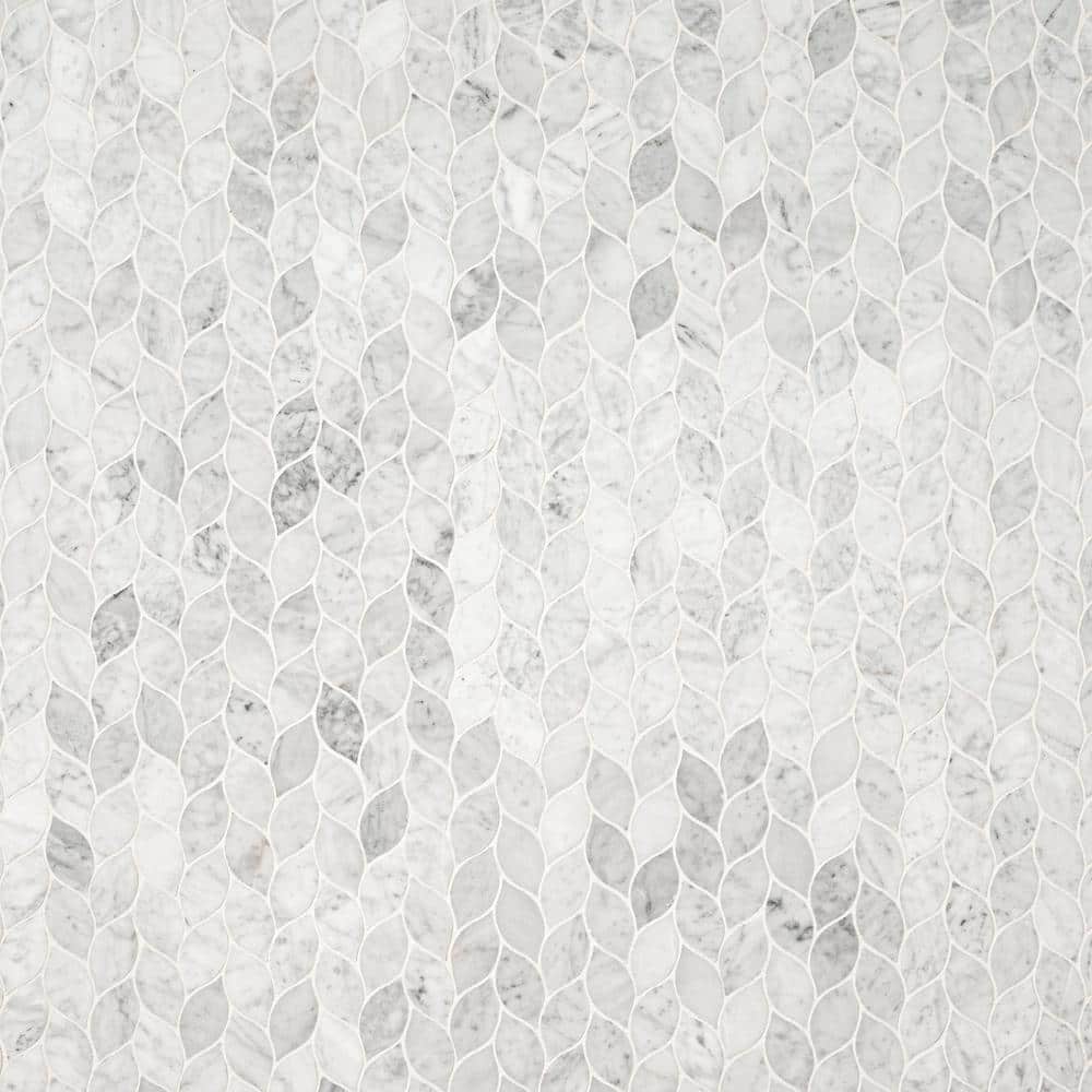 This mosaic’s leaf-like silhouette ripples across the surface, casting a serene rhythm in Carrara’s cool whites and gentle grays. The honed finish tempers the marble’s glamour with a velvety matte touch, perfect beside brushed metals and warm woods. Run it full-height behind a vanity or wrap a kitchen niche for sculptural texture that feels bespoke. It’s a quiet yet opulent essential that elevates everyday spaces into refined retreats.