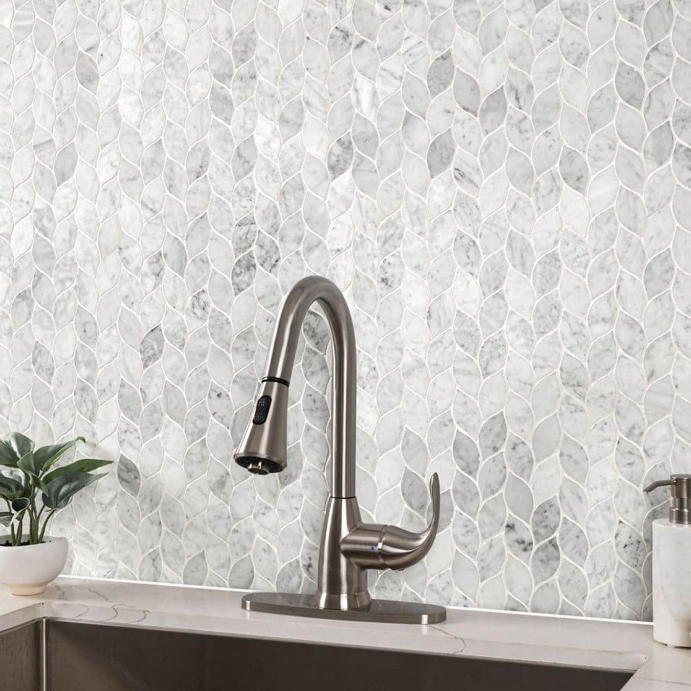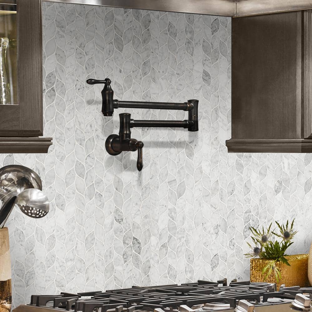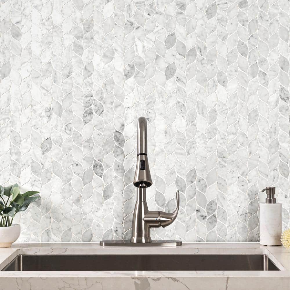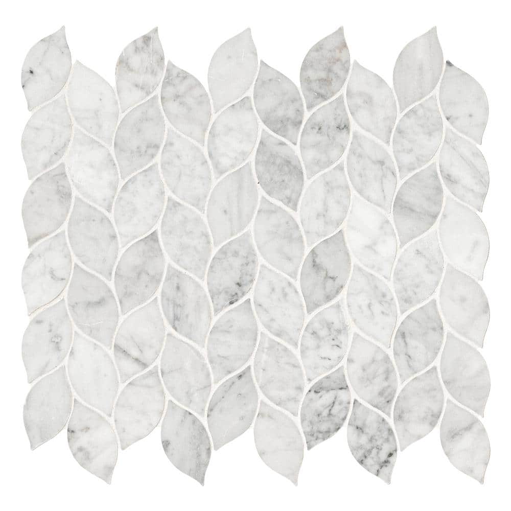 This mosaic’s leaf-like silhouette ripples across the surface, casting a serene rhythm in Carrara’s cool whites and gentle grays. The honed finish tempers the marble’s glamour with a velvety matte touch, perfect beside brushed metals and warm woods. Run it full-height behind a vanity or wrap a kitchen niche for sculptural texture that feels bespoke. It’s a quiet yet opulent essential that elevates everyday spaces into refined retreats.