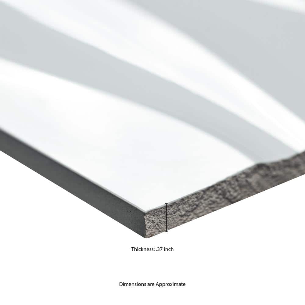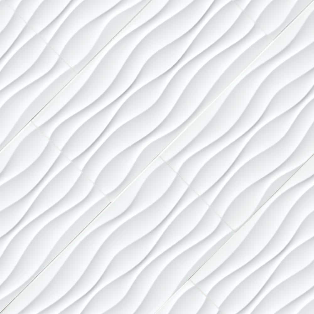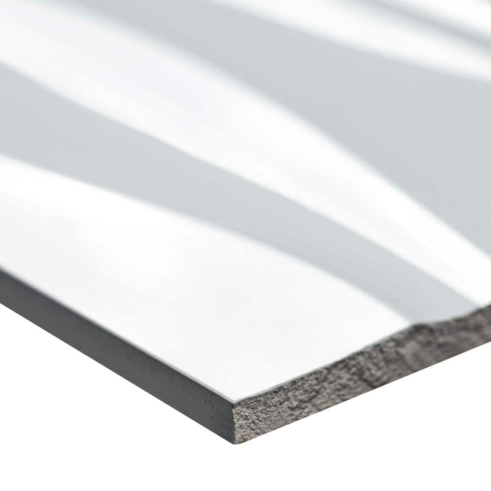 A modern 3D wavy ceramic wall tile with a high-gloss finish that brightens and adds texture to interiors. Ideal for backsplashes, shower surrounds, and accent walls, each case covers 16 sq. ft. and includes eight 12 in. x 24 in. tiles.