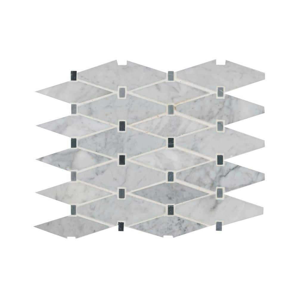 Sophisticated marble mosaic tile featuring a geometric diamond pattern in a polished finish. Mesh-mounted 12 in. x 12 in. sheets install easily on walls and floors for kitchens, baths, fireplaces, and more. Natural marble delivers timeless luxury with frost resistance for select outdoor use.