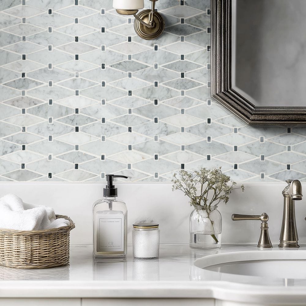 Marbella Diamond casts a luminous rhythm across your surfaces—polished marble facets catching the light like jewelry for the home. The elongated diamonds and petite inserts create a tailored pattern that feels both classic and fresh. Pair it with brushed brass and crisp whites on a vanity wall, or let it glide across a serene bath floor for quiet drama. It’s a statement of refined luxury that transforms everyday spaces into elevated retreats.