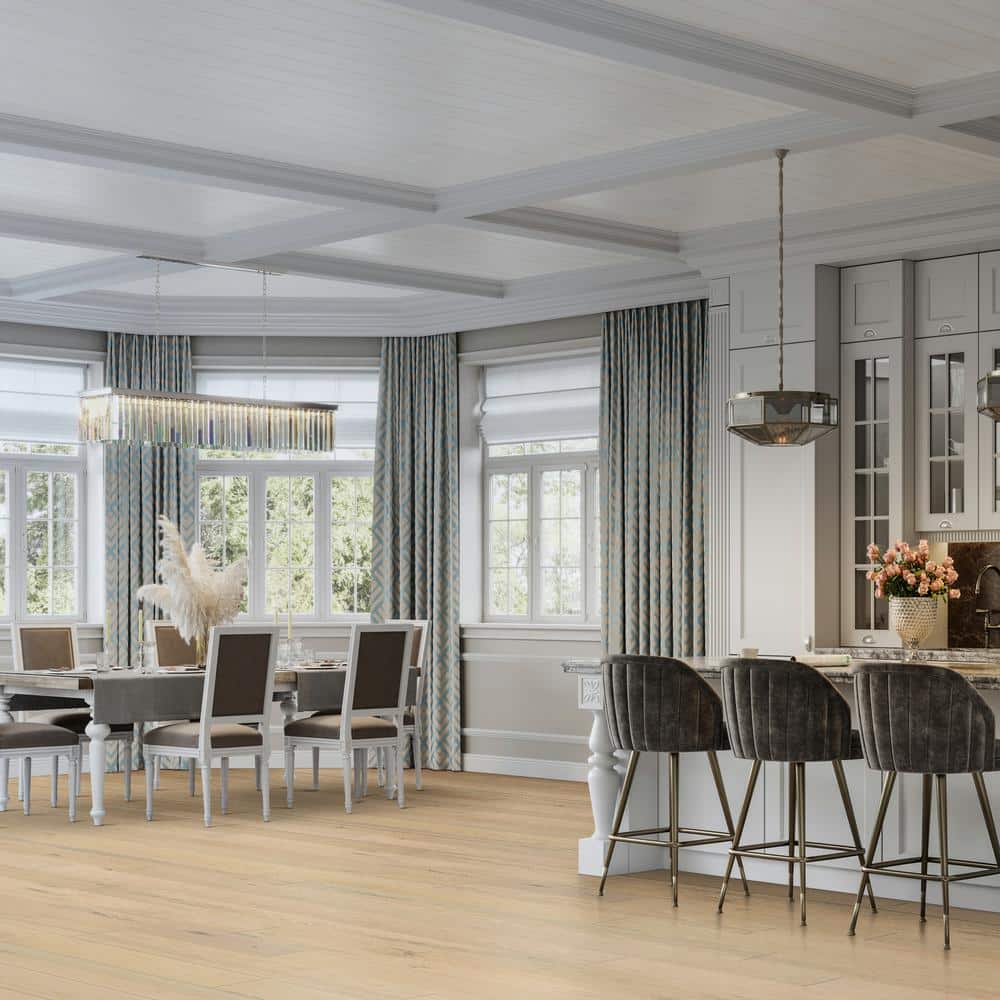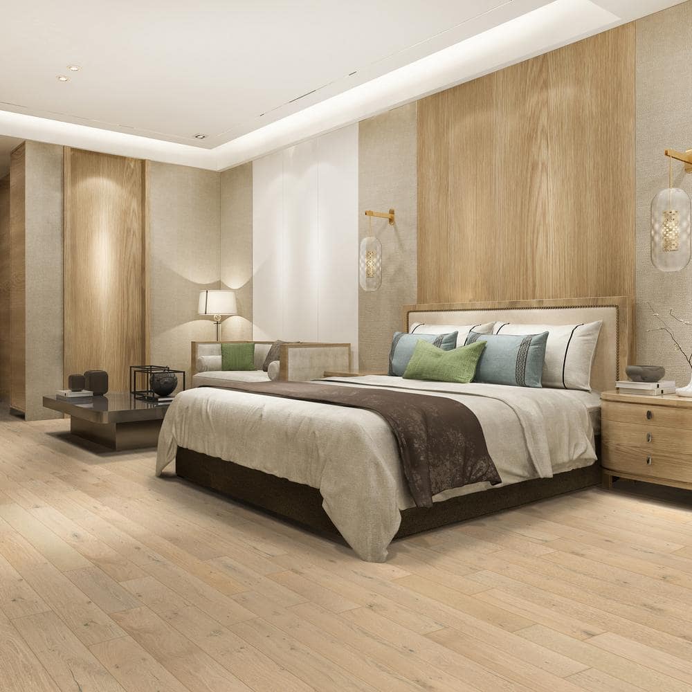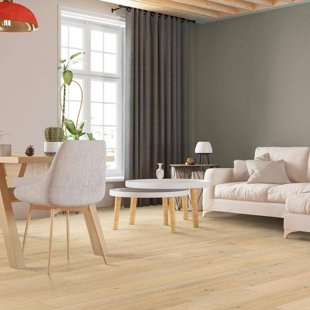 Transcend ordinary interiors with Tustin Grove White Oak Engineered Hardwood Flooring. These wide, wire-brushed planks introduce a symphony of rustic charm and sophistication, transforming spaces with their warm tan hues and natural wood character. Picture these elegant planks guiding guests through a luxuriously crafted living room. Essential for those who appreciate detail, Tustin Grove reaches beyond utility to become a focal point of luxe interiors.