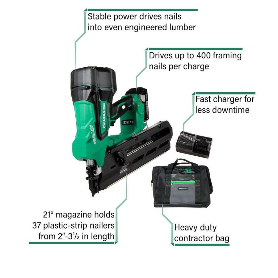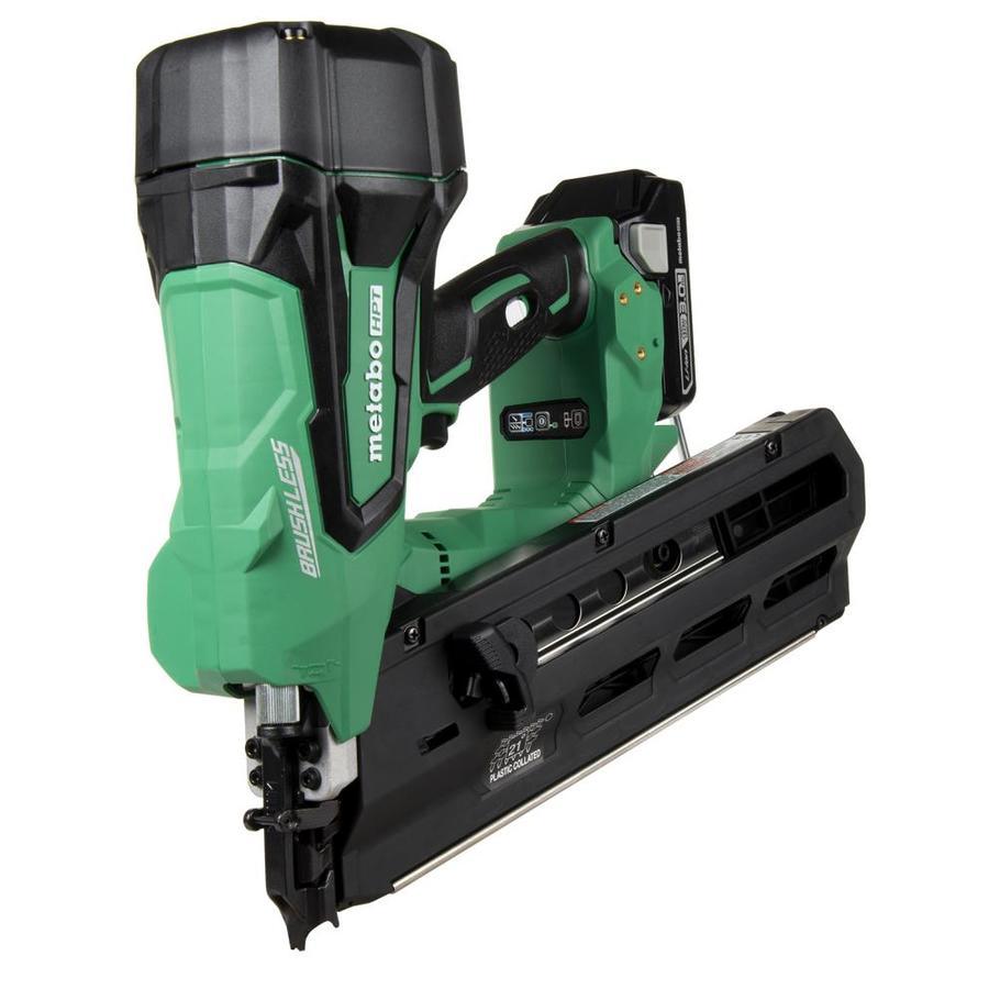 CORDLESS FREEDOM: Pneumatic power with 18 volt cordless freedom FASTENERS: Accepts round head 21 degree plastic strip collated nails from 2 Inch up to 3-1/2 inch in length and (0.113 to 0.131) POWER: Drives 400 Nails per charge using Metabo HPT's new compact 3.0 Ah Li-ion battery(included) APPLICATIONS: Ideal for all construction framing applications but is particularly useful for punch-out work on a jobsite without the need for a tank or hose DEPTH ADJUSTMENT: Get a professional finish with varying materials with the tool-less depth of drive adjustment PNEUMATIC-LIKE FEEL: The unique air spring drive system delivers similar performance as a pneumatic nailer EASY SWITCH FROM BUMP TO SEQUENTIAL: Quickly transition between sequential mode and bump fire mode with the actuation on the control panel ZERO RAMP UP: There is no refilling of the air tank required, so pull the trigger and tool will shoot the nail BRUSHLESS MOTOR TECHNOLOGY: Experience longer run time per charge, less maintenance and increased durability