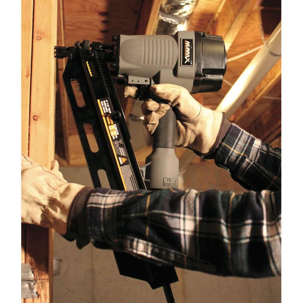 The NuMax SFR2190 Pneumatic 21° 3-1/2 in. Full Round Head Framing Nailer provides cost effective speed and power for projects such as framing, truss assembly, sheathing, subfloors, deck work, fencing, pallets, crates and assembling furniture. This air powered nail gun is compatible with 10-12-Gauge plastic collated 21° full round head framing nails from 2 in. to 3-1/2 in. The rugged framing nailer features a one piece drive blade for increased durability and a lightweight magnesium body perfect for extended use. A simple pull-back pusher makes the magazine easy to reload when the anti-dry-firing threshold is met, designed to reduce damage on internal components and extend the life of the tool. The dual mode trigger allows for bump or sequential firing and the no mar safety contact tip eliminates damage to working surfaces. The framing nail gun also features a comfort grip handle for increased control during longer jobs, and a 360° adjustable exhaust to direct air away from your face and debris. An air connector, air tool oil and adjustment tools are included. The Pneumatic 21° 3-1/2 in. Full Round Head Framing Nailer is essential for DIYers tackling home improvement and repair projects and professional construction contractors at the job site, and is covered by NuMax's 1 Year Limited Warranty and 30 Day Wearable Parts Warranty.1.