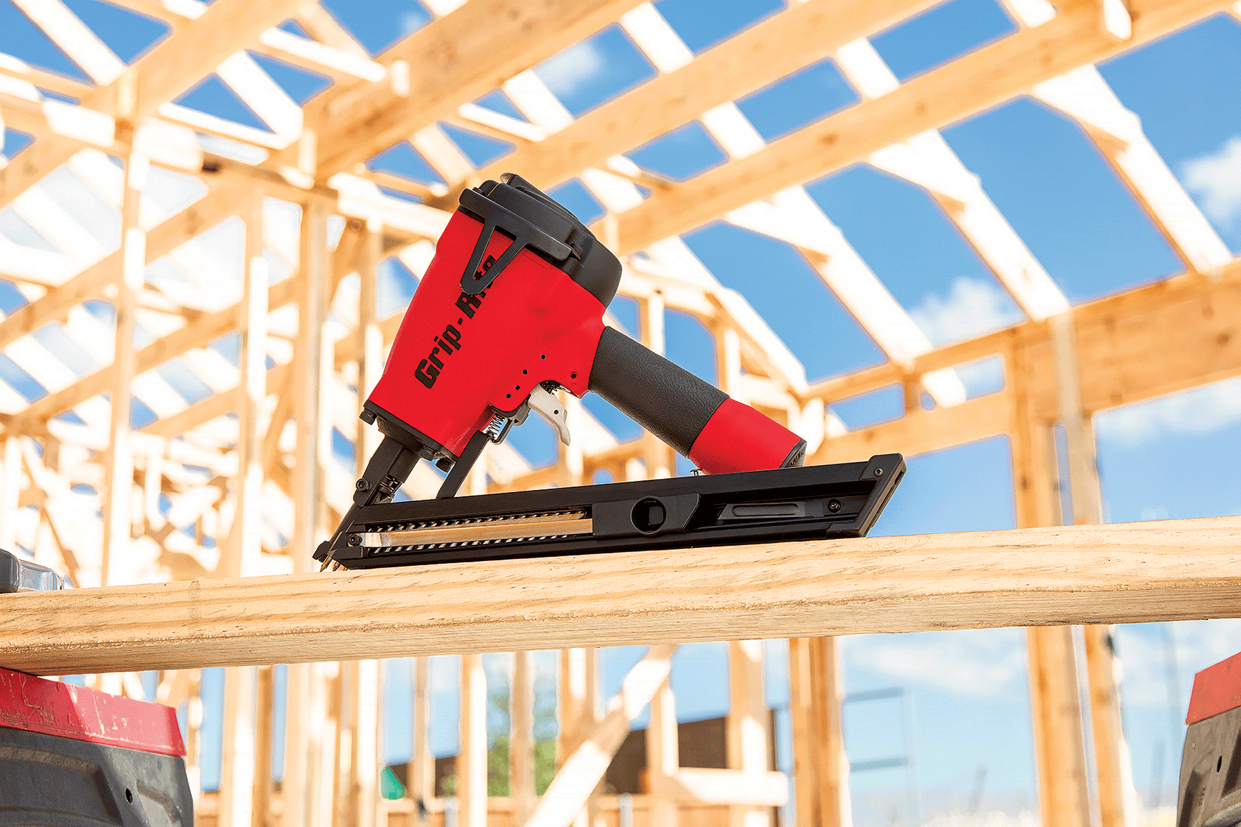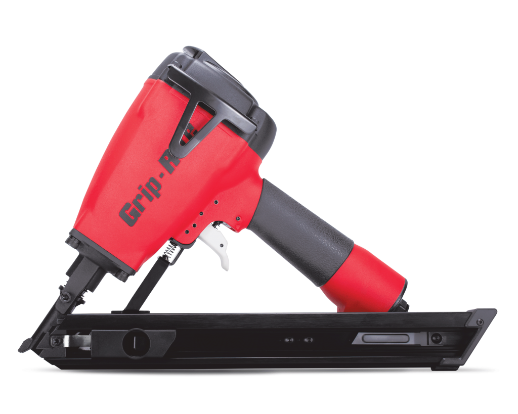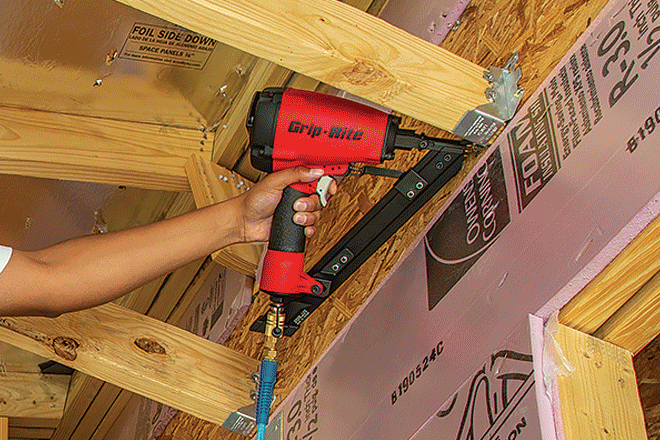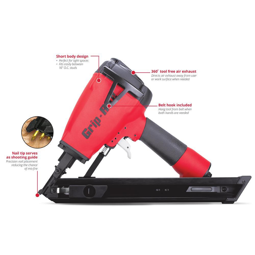 Design Features Nail tip shooting guide; short body fits between 12 in. O.C. joists; 360° tool-free air exhaust; belt hook; rear-loading design
