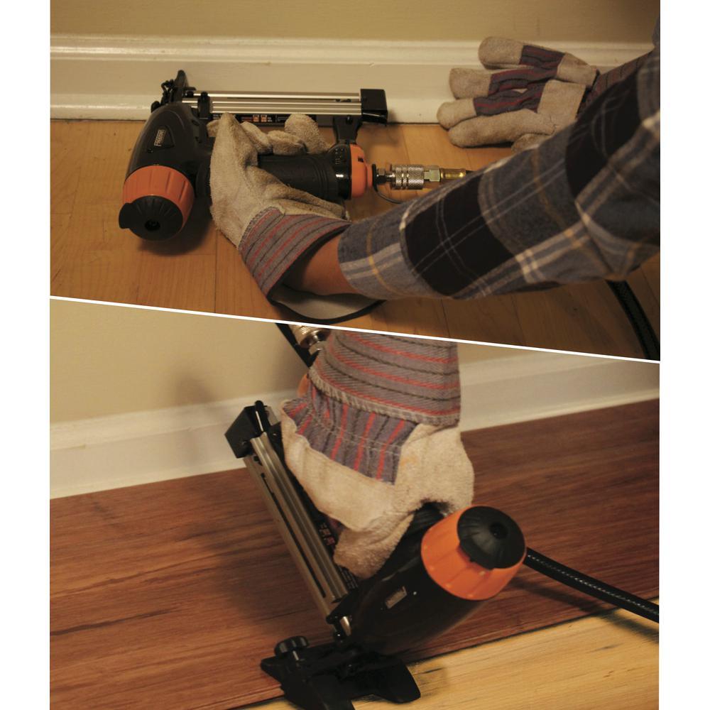 - 4-in-1 mini flooring nailer and stapler: ideal for installing 1/4 in. to 1/2 in. solid or engineered flooring with the 45° flooring base attachment, or trim and finish work with the regular nose cover