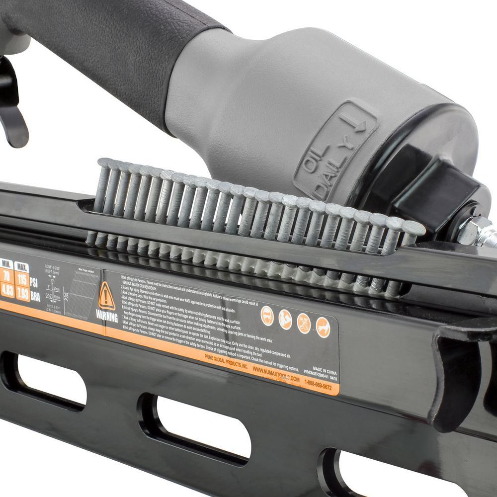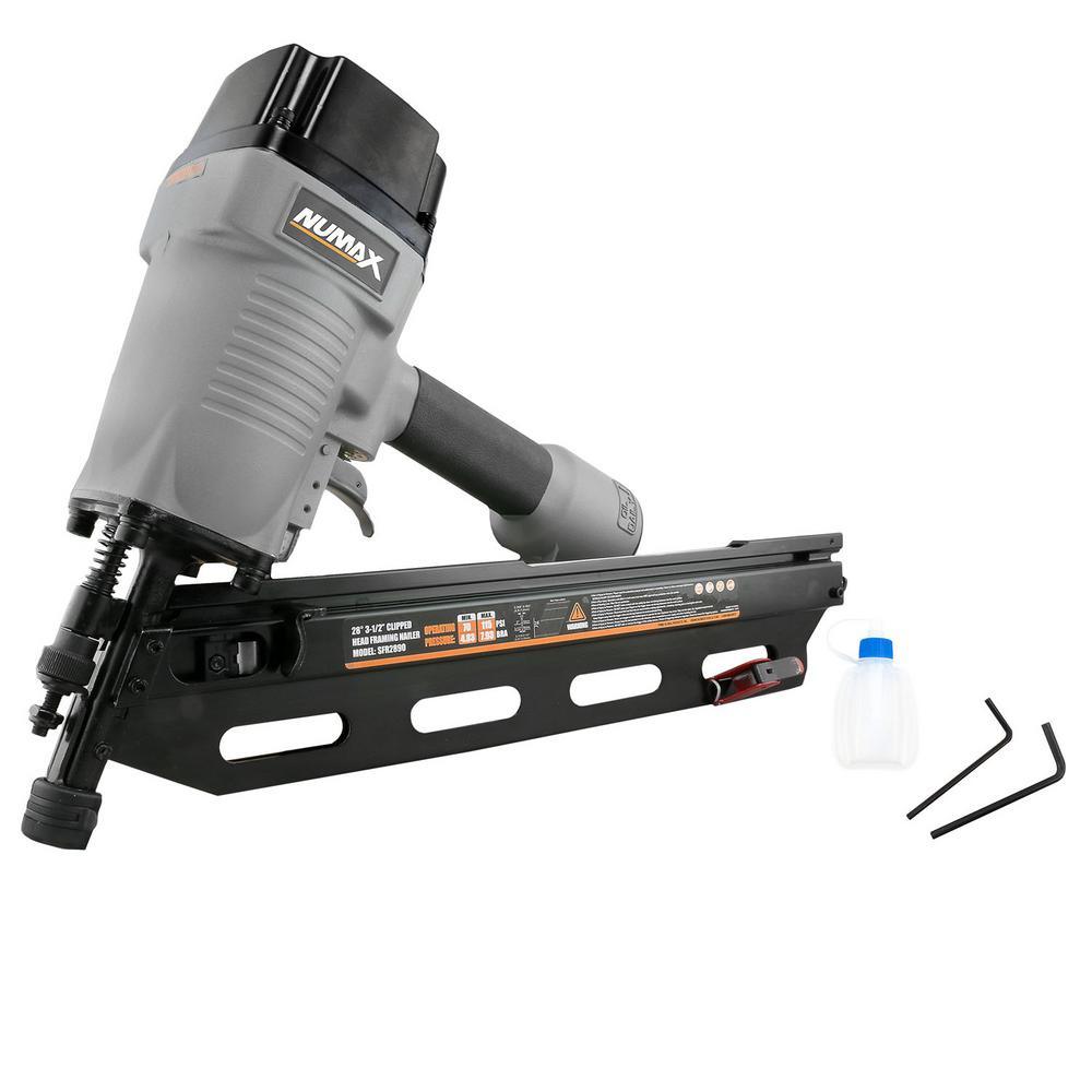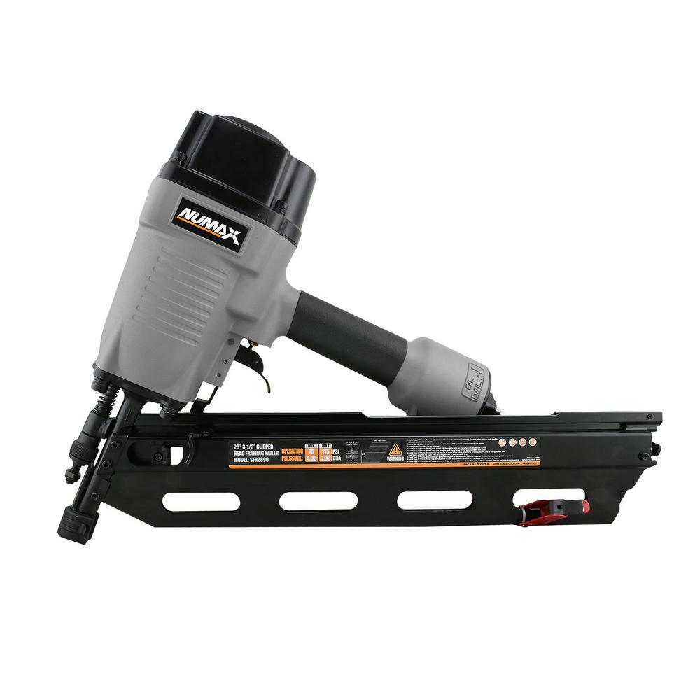 The NuMax SFR2890 Pneumatic 28° 3-1/2 in. Clipped Head Framing Nailer is great for DIYers working on home improvement projects as well as professional construction contractors at the job site. Use this pneumatic tool for applications such as framing, truss assembly, sheathing, subfloors, deck work, fencing, pallets, crates, and assembling furniture. This air powered nail gun is compatible with 10-Gauge to 12-Gauge wire or paper collated 28° clipped head framing nails from 2 in. to 3-1/2 in. The rugged framing nailer features a 1-piece drive blade for increased durability and a lightweight magnesium body perfect for extended use. A simple pull-back pusher makes the magazine easy to reload when the anti-dry-firing threshold is met, designed to reduce damage on internal components and extend the life of the tool. The dual mode trigger allows for bump or sequential firing, and the no mar safety contact tip eliminates damage to working surfaces. This nail gun also features a comfort grip handle for increased control during longer jobs, and a convenient 360° adjustable exhaust to direct air away from your face. The affordable Pneumatic 28 3-1/2 in. Clipped Head Framing Nailer will allow you to finish jobs quickly, and is covered by NuMax's 1-Year Limited Warranty and 30-Day Wearable Parts Warranty.