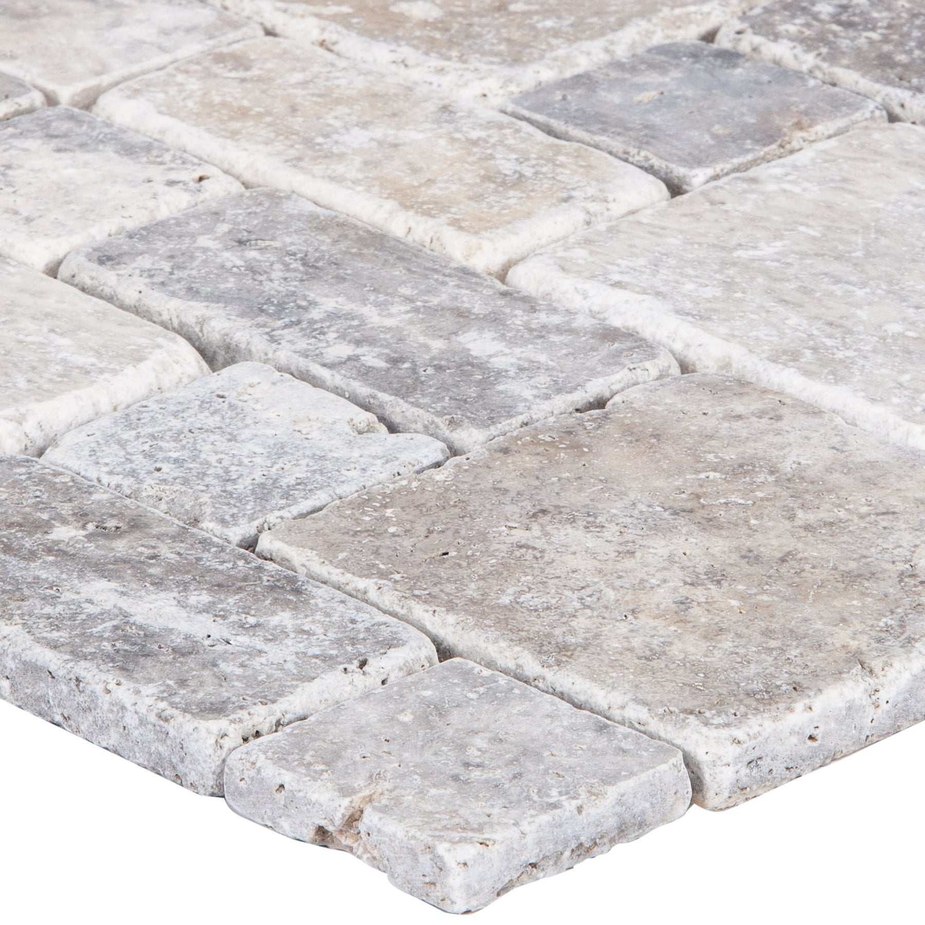 The Satori Silver Crescent Honed Mosaic Wall Tile creates a sophisticated natural stone look in any home improvement project. Each 12-in x 12-in tile showcases warm gray and tan hues with a Versailles pattern, offering an elegant upgrade that withstands medium to heavy traffic. Perfect for walls, backsplashes, and oven surrounds, its travertine construction is both timeless and versatile.