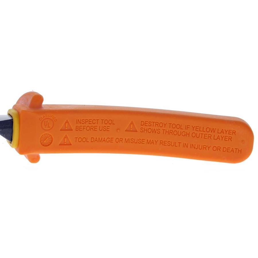 High visibility double insulated handles rated for 1000 volts Drop-forged, high carbon steel construction Laser-hardened blades cut hardened wire, bolts and stainless steel wire Narrow profile head designed for working in tight areas Serrated jaws provide secure gripping surface Meets ASTM F1505-01 and IEC 60 900 standards Meets OSHA requirements for insulated tools (29 CFR 1910) Knife-to-anvil blades never need resharpening 1000 Volt certified (1000V AC, 1500V DC)