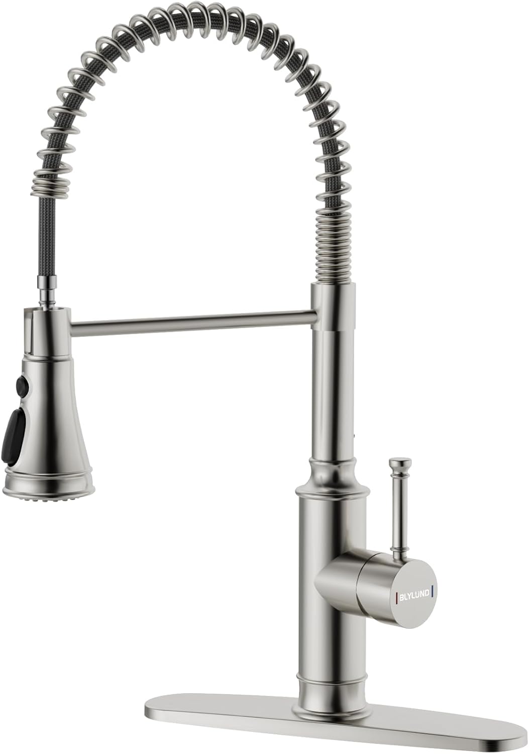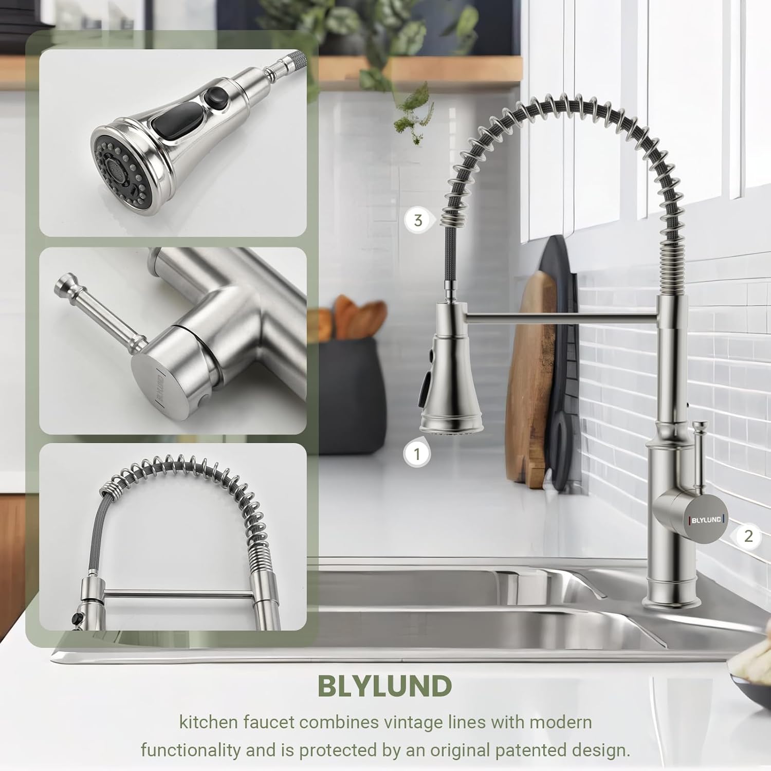 This BLYLUND kitchen faucet transforms your space with its vintage-inspired design and brushed nickel finish. The high-arc gooseneck spout adds a touch of sophistication, while the pull-down sprayer ensures practicality. Pair it with a farmhouse sink for a cohesive and luxurious kitchen aesthetic. A must-have for those who value both style and functionality.