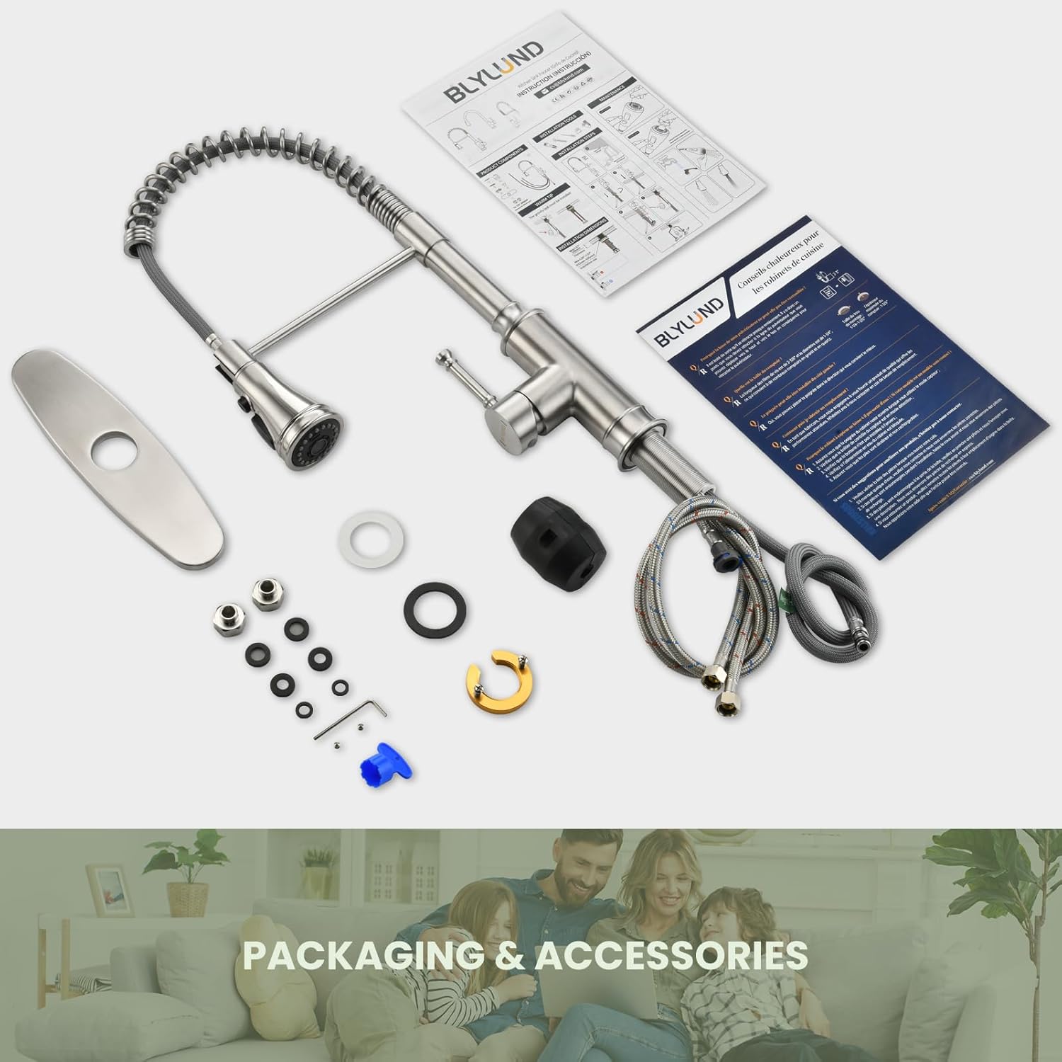The BLYLUND Commercial Kitchen Faucet features a brushed nickel finish and a high-arc pull-down sprayer for versatile use. Its durable stainless steel construction and 360-degree swivel design make it a stylish and functional addition to any kitchen.