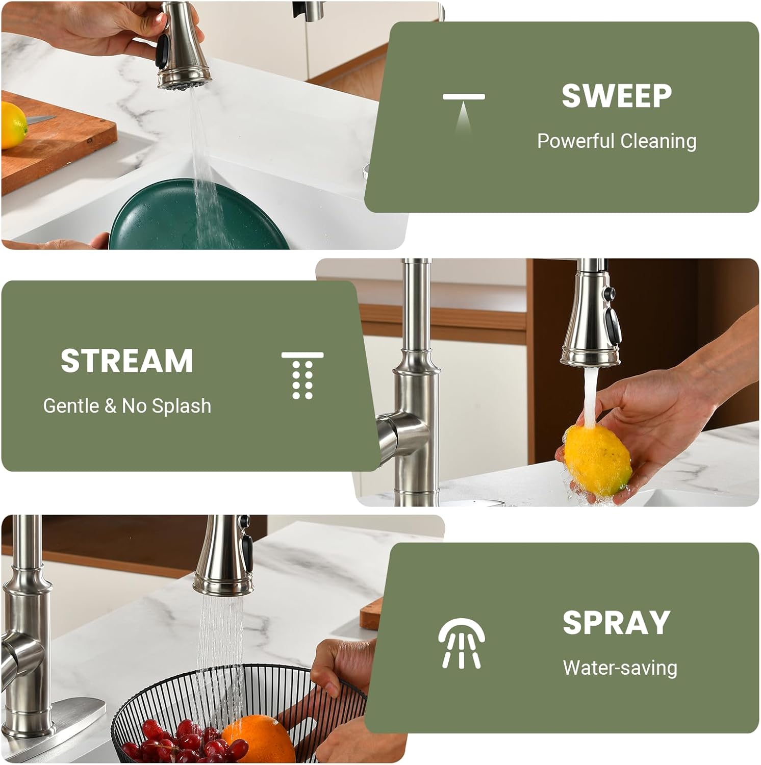 • 3-Mode Sprayer: Offers aerated stream, powerful spray, and broom modes.