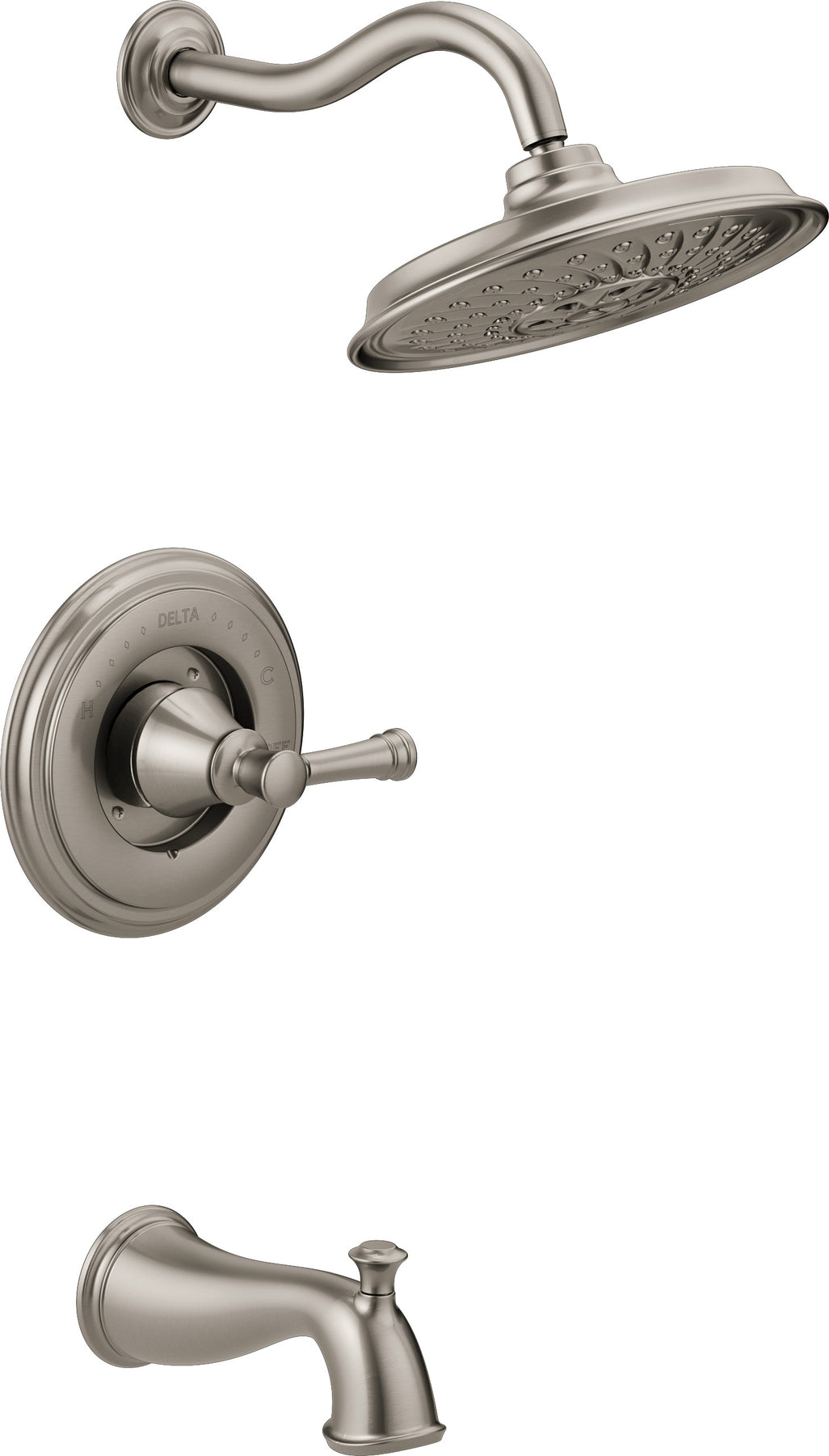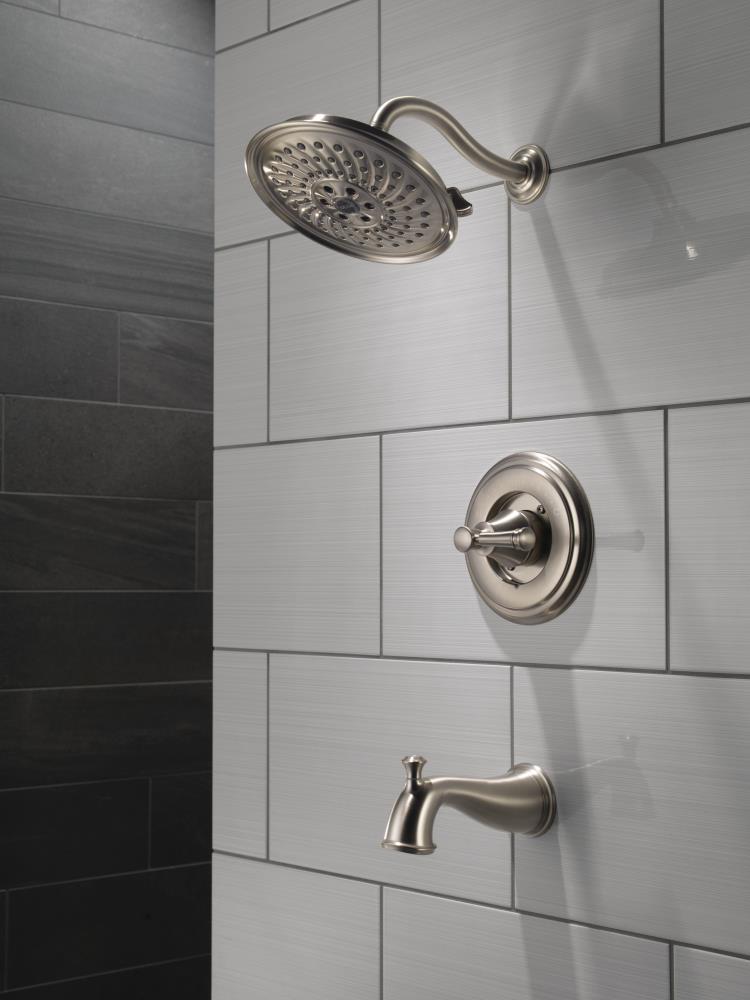 This Delta Valdosta tub and shower faucet set delivers a drenching, luxurious spray with H2Okinetic technology while resisting water spots and fingerprints with SpotShield Brushed Nickel. The complete kit includes a multi-function showerhead, tub spout, single lever handle, and MultiChoice Universal valve for safe, balanced temperature control.