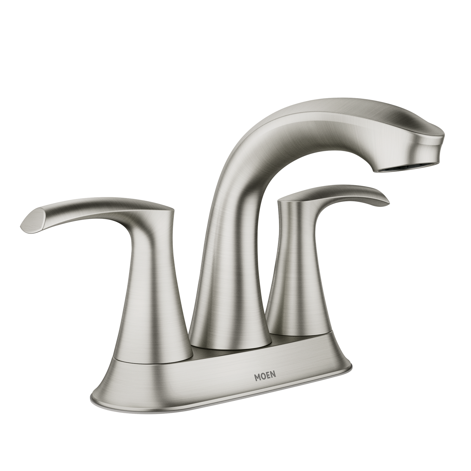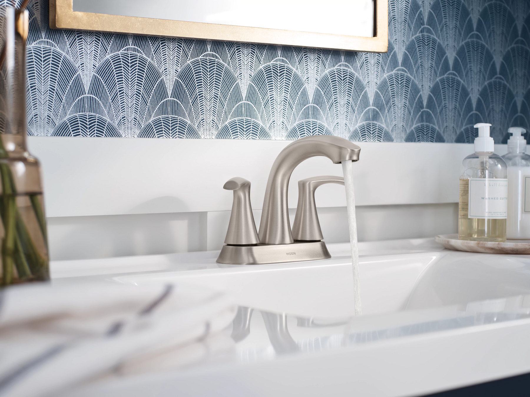 The Moen Graeden centerset faucet pairs smooth transitional lines with a Spot Resist Brushed Nickel finish that resists fingerprints and water spots. Its 4-inch, two-handle design offers easy temperature control and includes a matching drain and deck plate for streamlined installation.