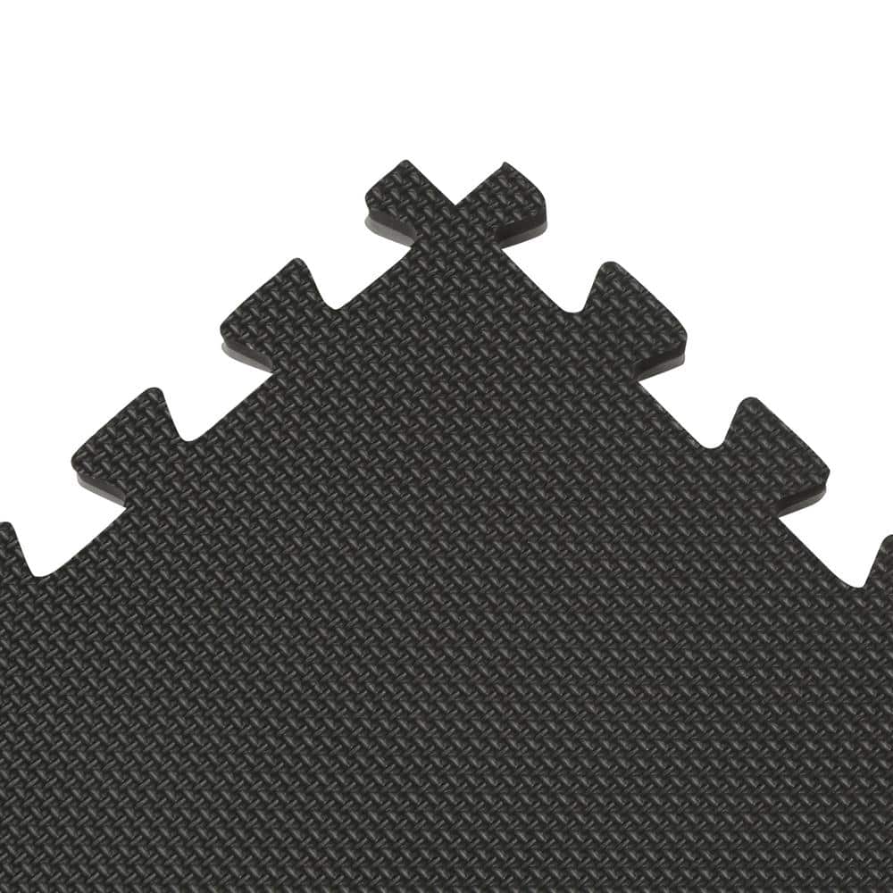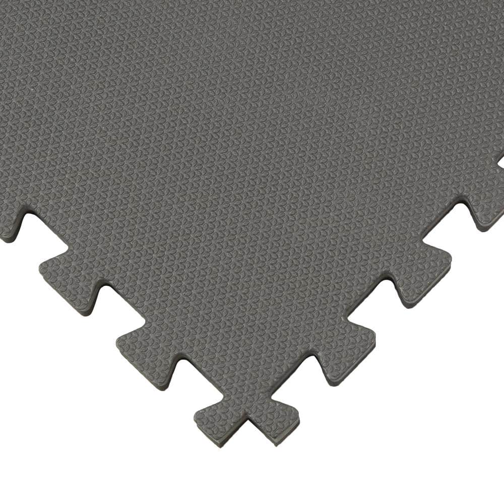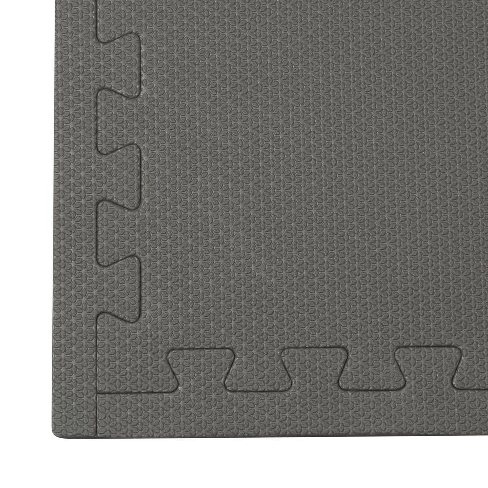 Durable EVA foam interlocking tiles provide cushioned, non-skid flooring for gyms, playrooms, workshops, and more. Each 24 x 24 in. tile is reversible in black/gray with textured surfaces for traction and easy, tool-free installation. Covers 48 sq. ft. per pack and includes removable borders for clean edges.