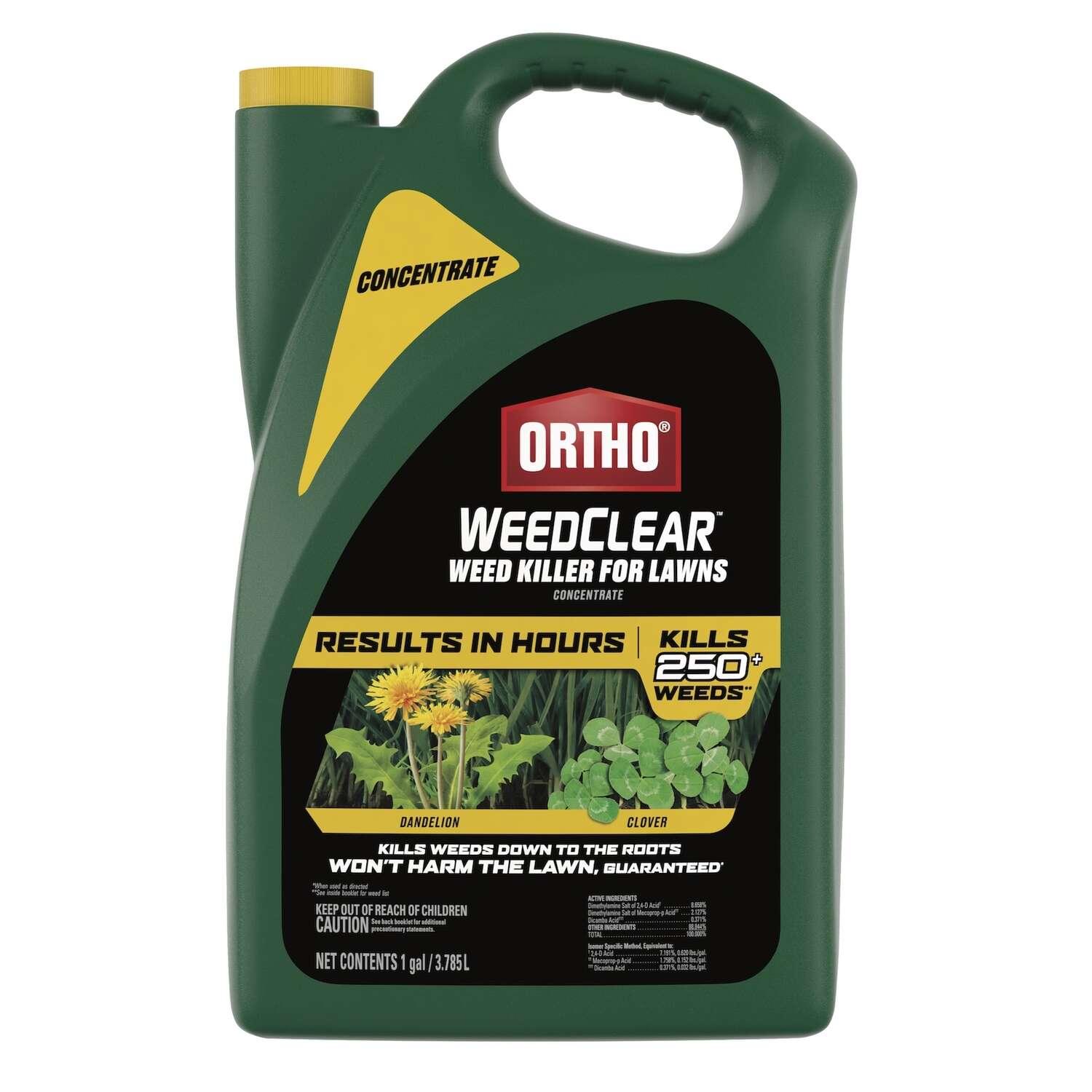 You can kill weeds without harming your lawn with Ortho® WeedClear™ Weed Killer for Lawns Concentrate (when used as directed). This weed killer kills over 250 common weeds, including dandelions, clover, poison ivy, sumac, chickweed, and dollarweed (see product label for complete weed list). It is made especially for residential lawns and contains three proven ingredients to specifically target and destroy other common lawn weeds, without harming your grass (when used as directed). This herbicide works by entering weeds through their leaves, and moves throughout the plant to kill all the way down to the root. You'll see visible results in hours, and it becomes rainproof within one hour upon drying. Easily apply this concentrated formula with an Ortho® Dial N Spray® or tank sprayer. People and pets may enter the treated area after the spray has dried. For best results, use when weeds are small and actively growing in the spring or fall. One 1-gal. bottle treats up to 64,000 sq. ft.