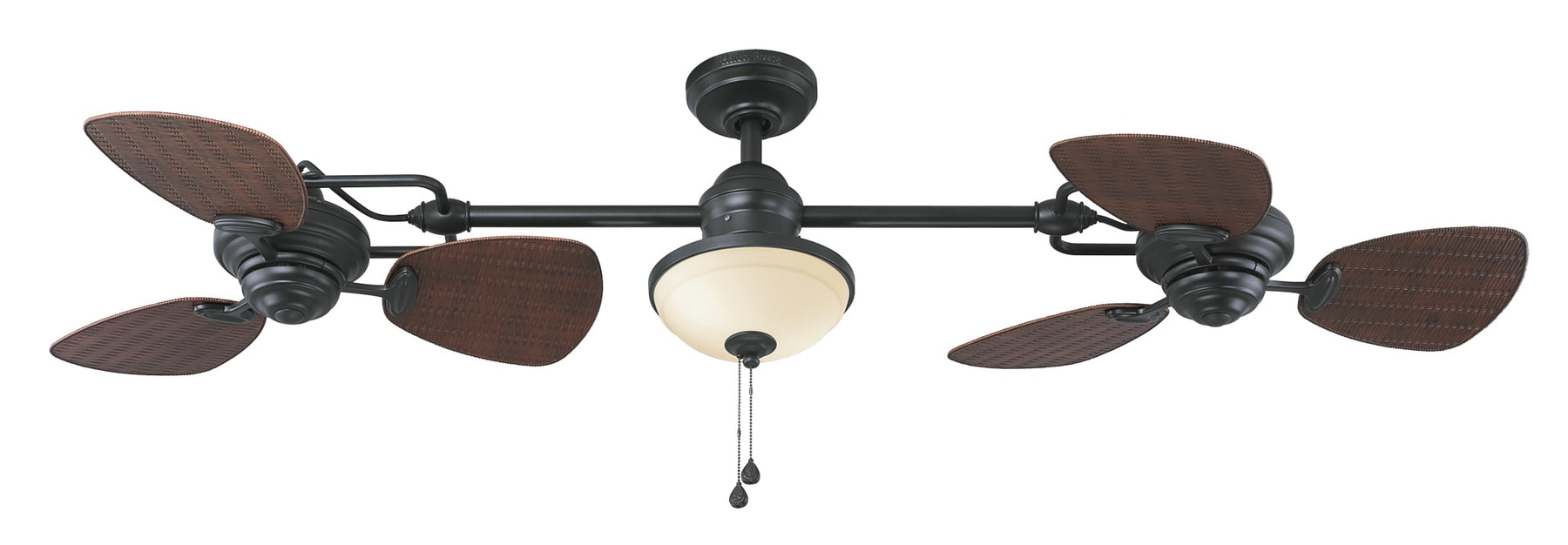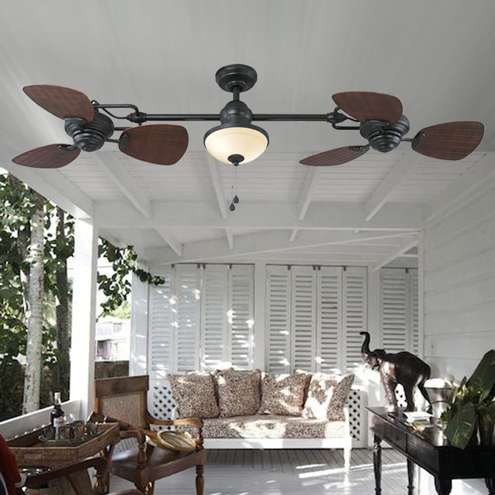 This Twin Breeze II features dual fan heads with six brown wicker blades to move up to 4,450 CFM—ideal for extra-large spaces. Finished in oil-rubbed bronze with a frosted glass bowl light kit, it includes a 4-in downrod and is damp rated for covered outdoor use.