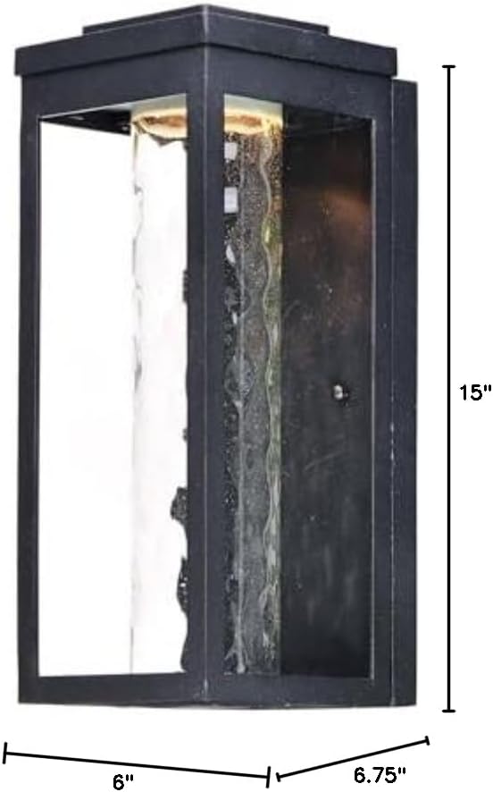 A sleek, dark-sky outdoor wall light with a black cast aluminum frame and water glass diffuser. The integrated 12W LED delivers warm white illumination with high CRI and efficient output, ideal for porches and entryways.