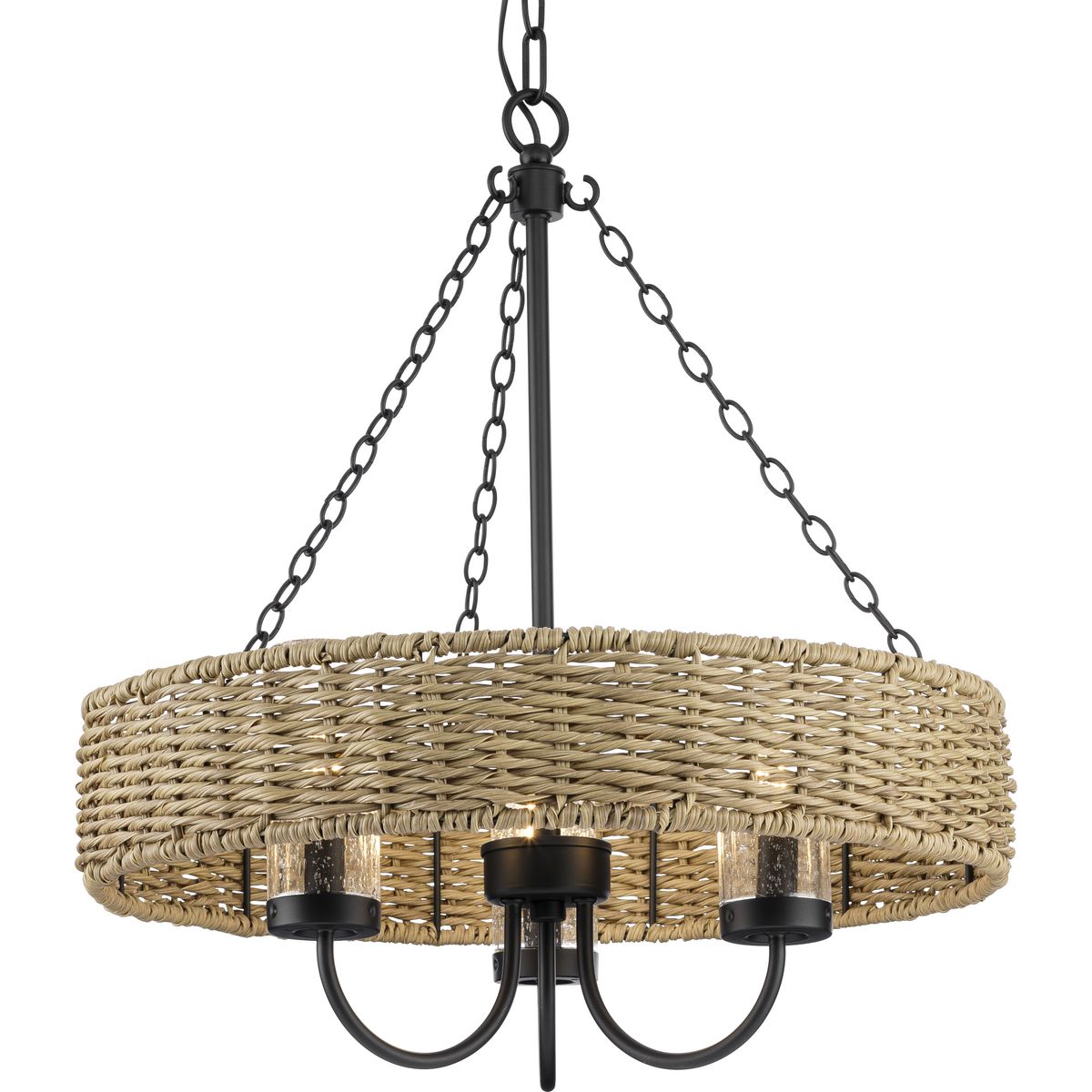 Illuminate your indoor or outdoor spaces with the Pembroke 3-Light Matte Black Coastal Chandelier. Its weather-resistant design, featuring a woven rattan and seeded glass construction, offers a blend of rustic charm and modern elegance that complements coastal and transitional settings.