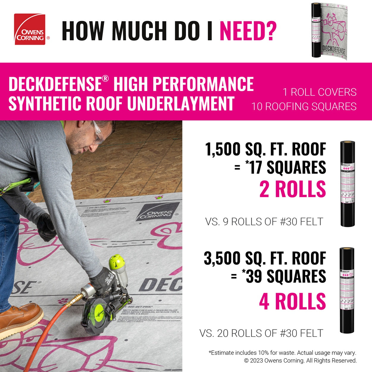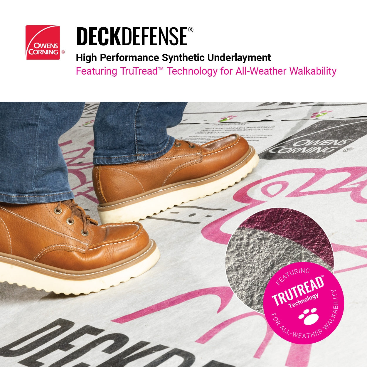 Owens Corning Deck Defense is a high-performance synthetic roof underlayment designed for superior walkability and protection. One 42-in x 286-ft roll covers 1,001 sq ft and features a textured TruTread surface and fusion back coating for grip in wet or dry conditions. Ideal as a reliable secondary water barrier under shingles.