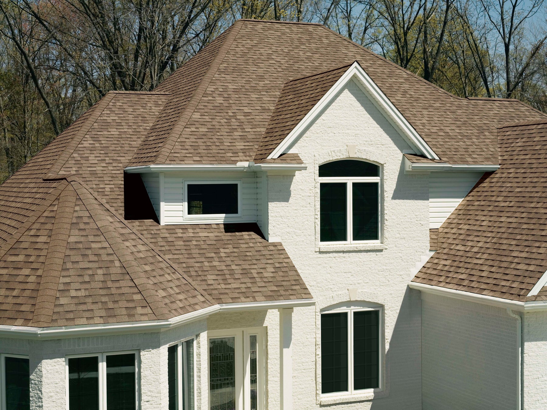 The Oakridge Sand Castle shingles layer the roofline in rich, tonal browns that bring warmth and dimension to the facade. The architectural profile adds subtle depth, pairing beautifully with creamy siding, brick, or natural stone. Style with copper accents or wood trim to echo the granular texture and create a cohesive, refined exterior. It’s a sophisticated finishing touch that feels both timeless and luxuriously crafted.