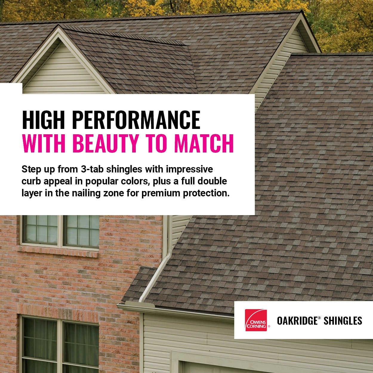 Owens Corning Oakridge laminated asphalt shingles deliver a durable, architectural look with warm Sand Castle tones. Each bundle covers 32.8 sq ft and is designed for long-lasting performance with a double-layer nailing zone, wind resistance, and a limited lifetime warranty.