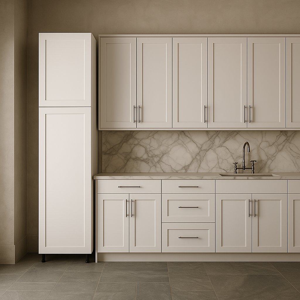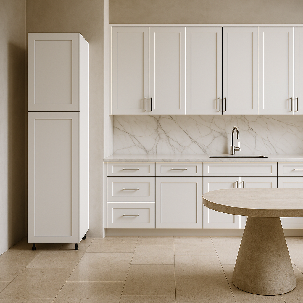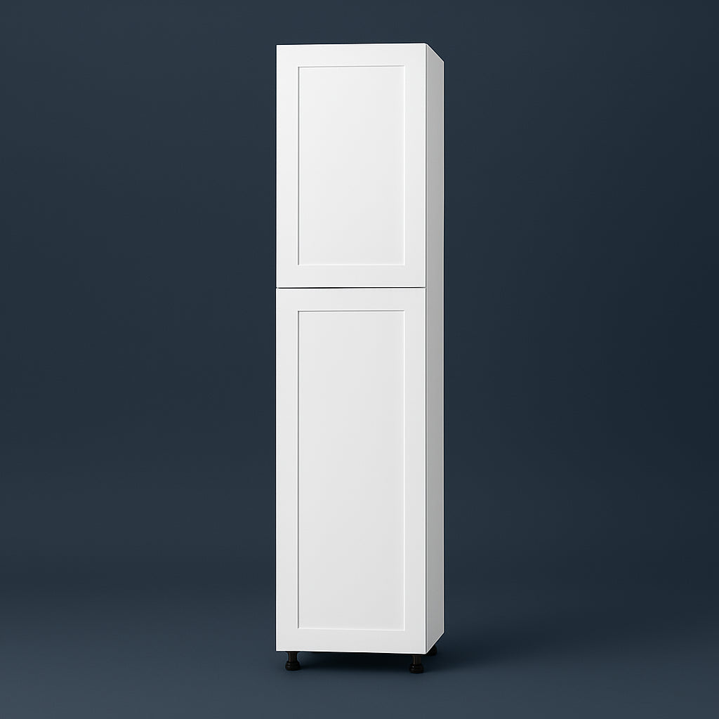 The Cambridge Everest White Shaker Pantry Cabinet transforms your kitchen into a haven of modern sophistication. Its frameless shaker design exudes clean lines and contemporary charm, while the matte white finish complements any decor. Style it alongside marble countertops and stainless steel appliances for a cohesive and luxurious look. This cabinet is not just storage; it's a statement piece that enhances the heart of your home.