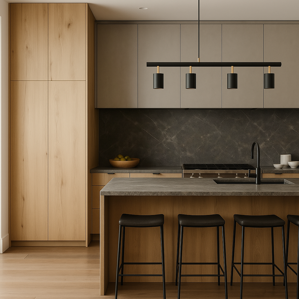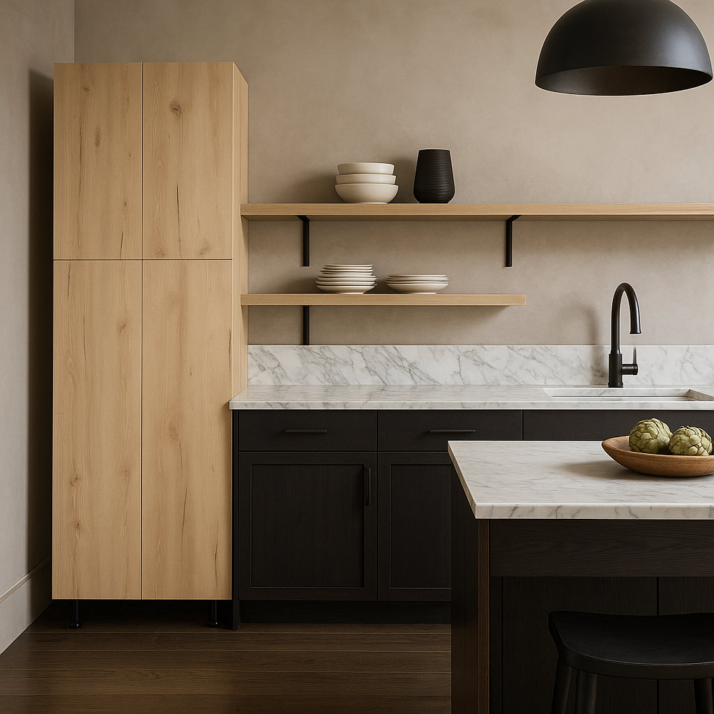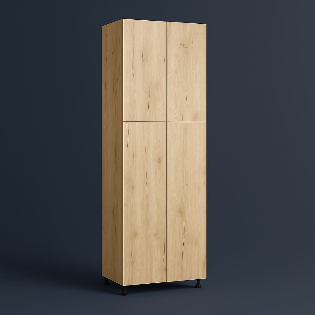 The Cambridge Radiance Pantry Cabinet combines modern design with practical functionality. Featuring a frameless construction and Light Oak laminate finish, it offers adjustable shelves and soft-close doors for a sleek and durable kitchen storage solution.