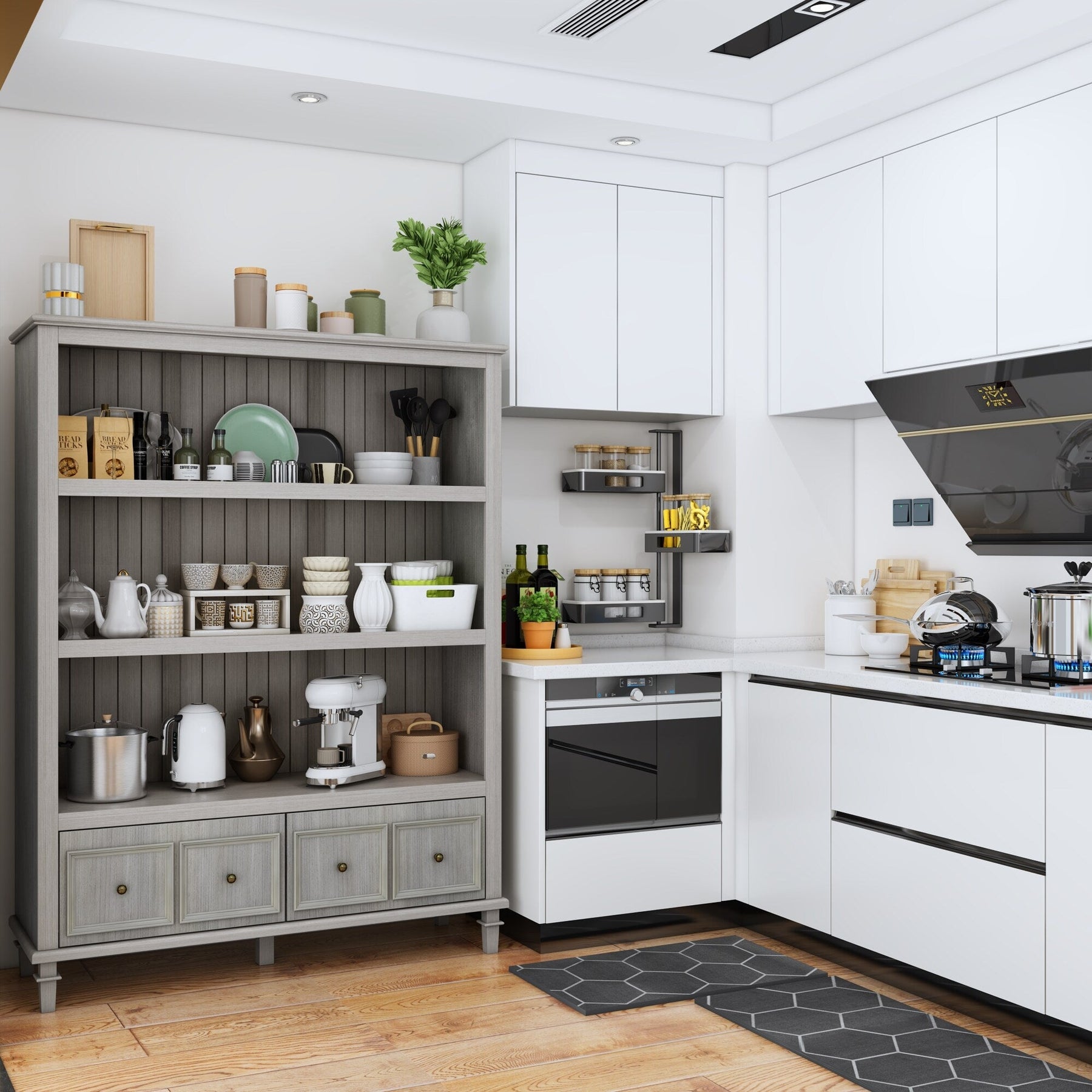 Transform your kitchen into a culinary sanctuary with the FUFU&GAGA Rustic Gray Kitchen Pantry. Its subtle, light-gray tone paired with a welcoming country/cottage style infuses any space with warmth and charm. The neat organization offered by its three open shelves and array of drawers invites an ordered aesthetic that doesn’t sacrifice character for function. Perfect as a standalone piece or complementing existing decor, this pantry echoes the essence of serene, sophisticated living.