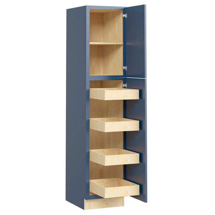 The Washington Vessel Blue Utility Pantry Cabinet from Home Decorators Collection offers a bold, deep blue hue to enhance any kitchen's aesthetic appeal. Constructed with durable plywood and featuring four rollout trays, it provides ample storage space while its soft-close doors ensure quiet operation. With a limited lifetime warranty, this cabinet promises both style and longevity.