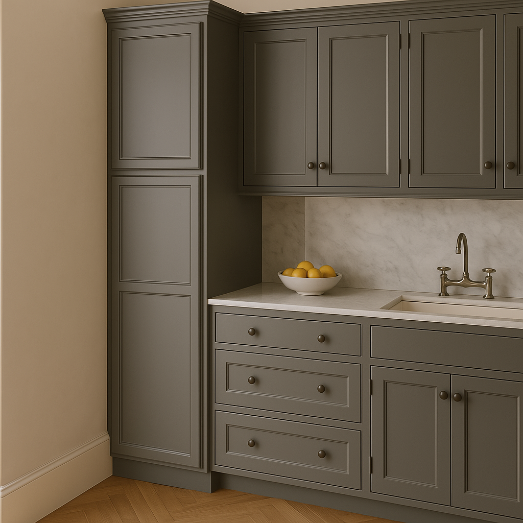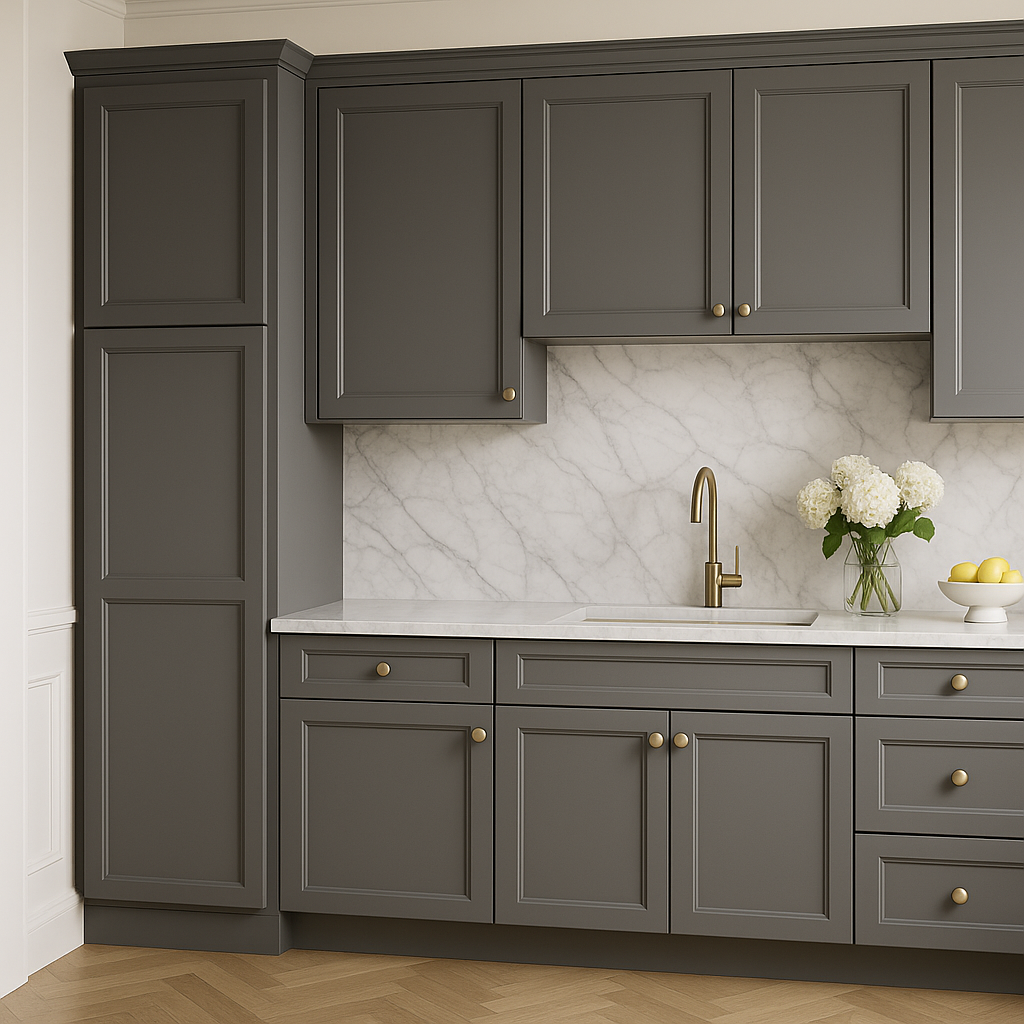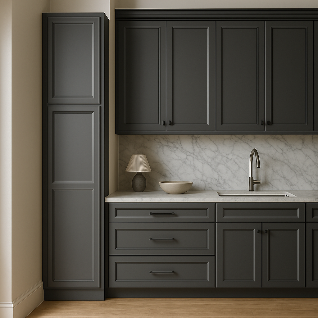 • Modern Shaker Design: Sleek charcoal finish with beveled door frames for a custom look.