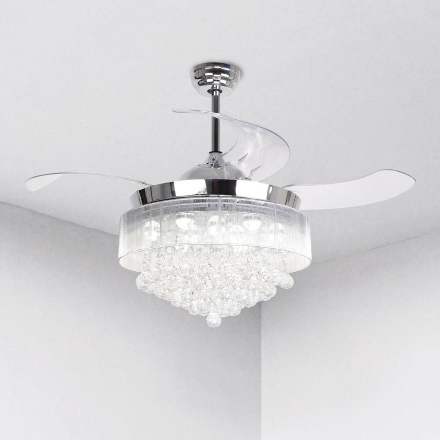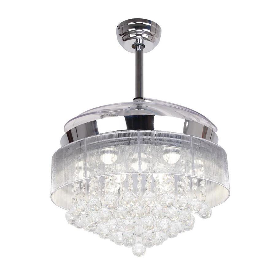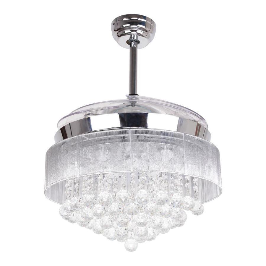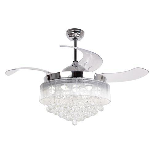 Modern crystal ceiling fan: retractable 4 blades ceiling fan and crystal chandelier 2 In. 1, fits perfectly in any modern-style environment Whisper-quiet motor quietly generates optimal airflow using 3-speeds feature providing year-round comfort 32-Watt light fixture using nine 3.5-watt LED bulbs(included), 4000 kelvin, replaceable but not dimmable,certificate listed, totally safe for everyday usage Remote control included- this high-end remote control allows you to control the light and the fan speed separately and from anywhere in the room Retractable blades- blades open and closed by remote control, when closed, it is a beautiful 20.75-inch crystal chandelier, when open, it is a 46-inch ceiling fan 46-In fan provides airflow up to 3600-CFM, making it ideal for small room 4-In and 10-In L down rod included (can also be installed as max 15 degrees angle mount) Offering a limited lifetime motor warranty on all ceiling fans; with a 1-year warranty on all parts