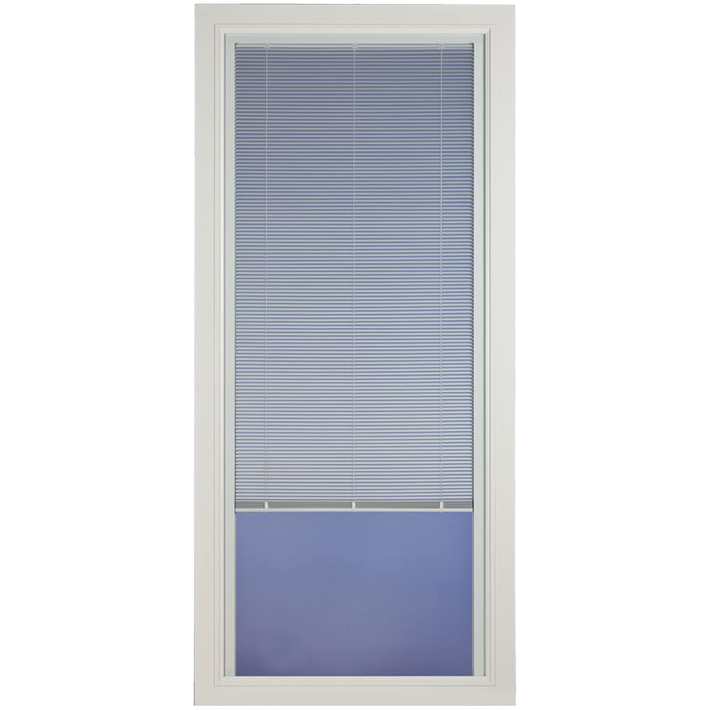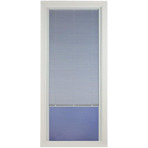 A durable, full-view aluminum storm door featuring blinds between the glass for privacy and light control. Insulated, tempered glass improves energy efficiency and reduces noise, while universal reversible hinging simplifies installation.