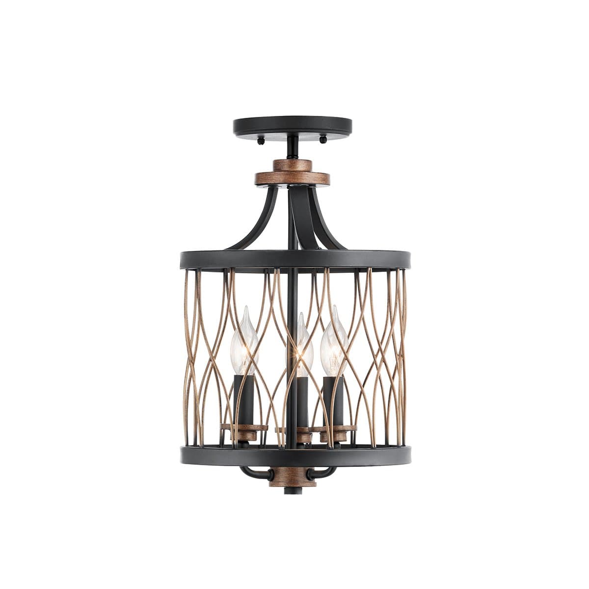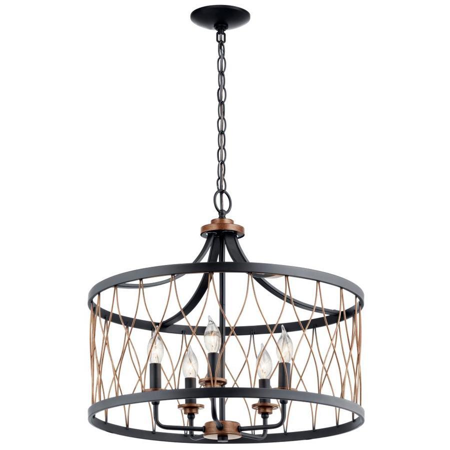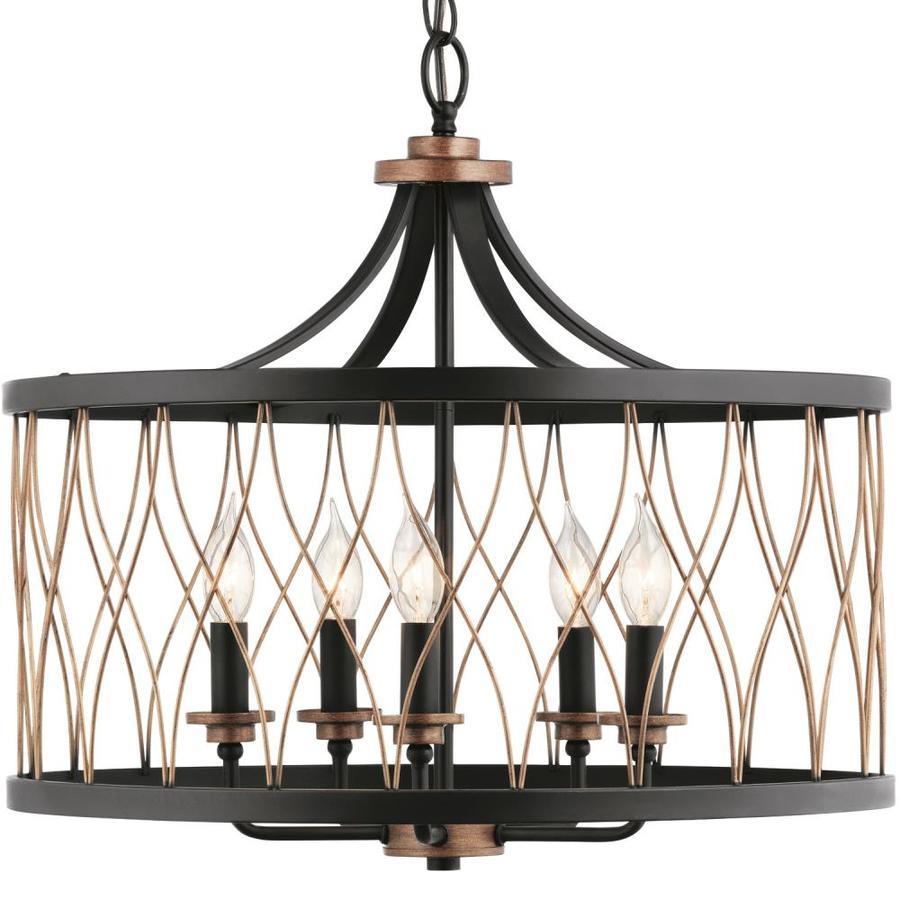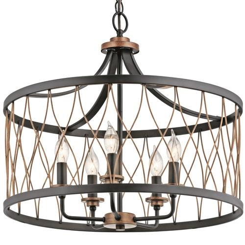 A French country-inspired drum pendant in black with gold-tone detailing, the Kichler Brookglen adds vintage charm and warm illumination. Its candelabra-style bulbs sit within a round wire basket, and the fixture can convert to a semi-flush mount for flexible installation.