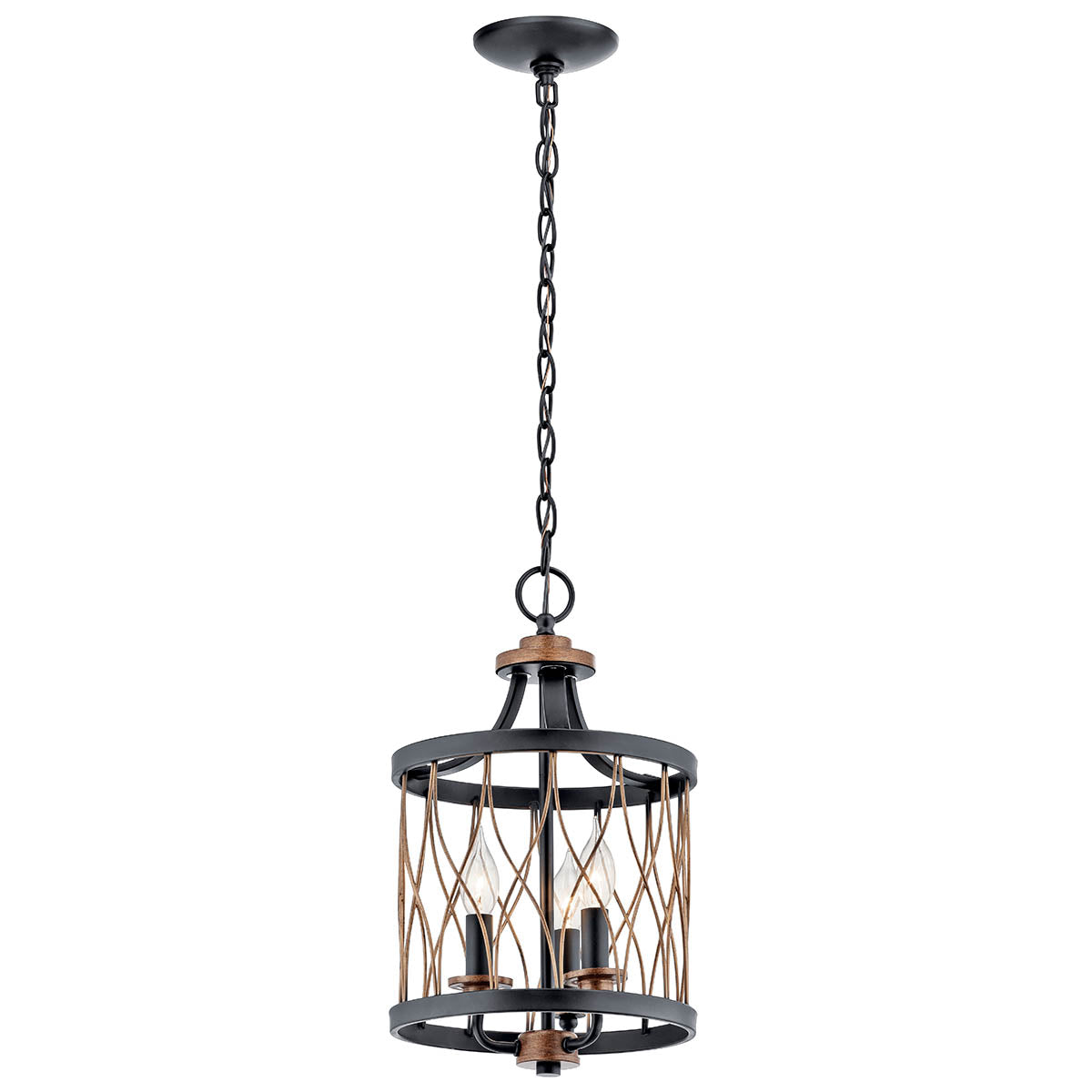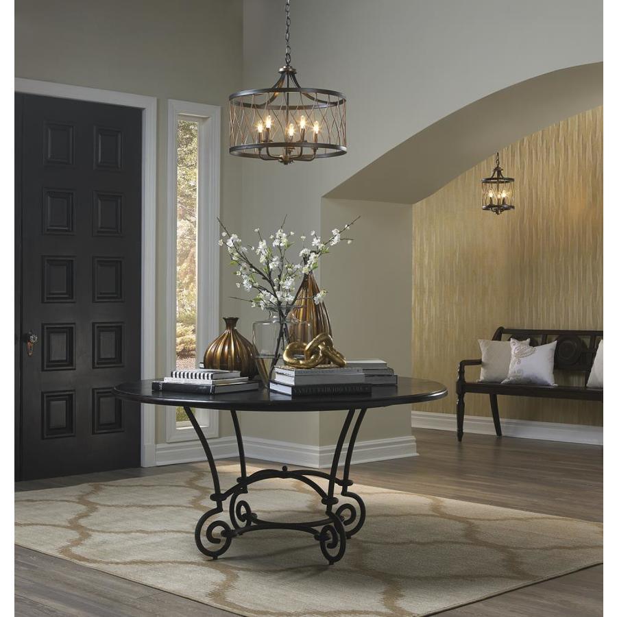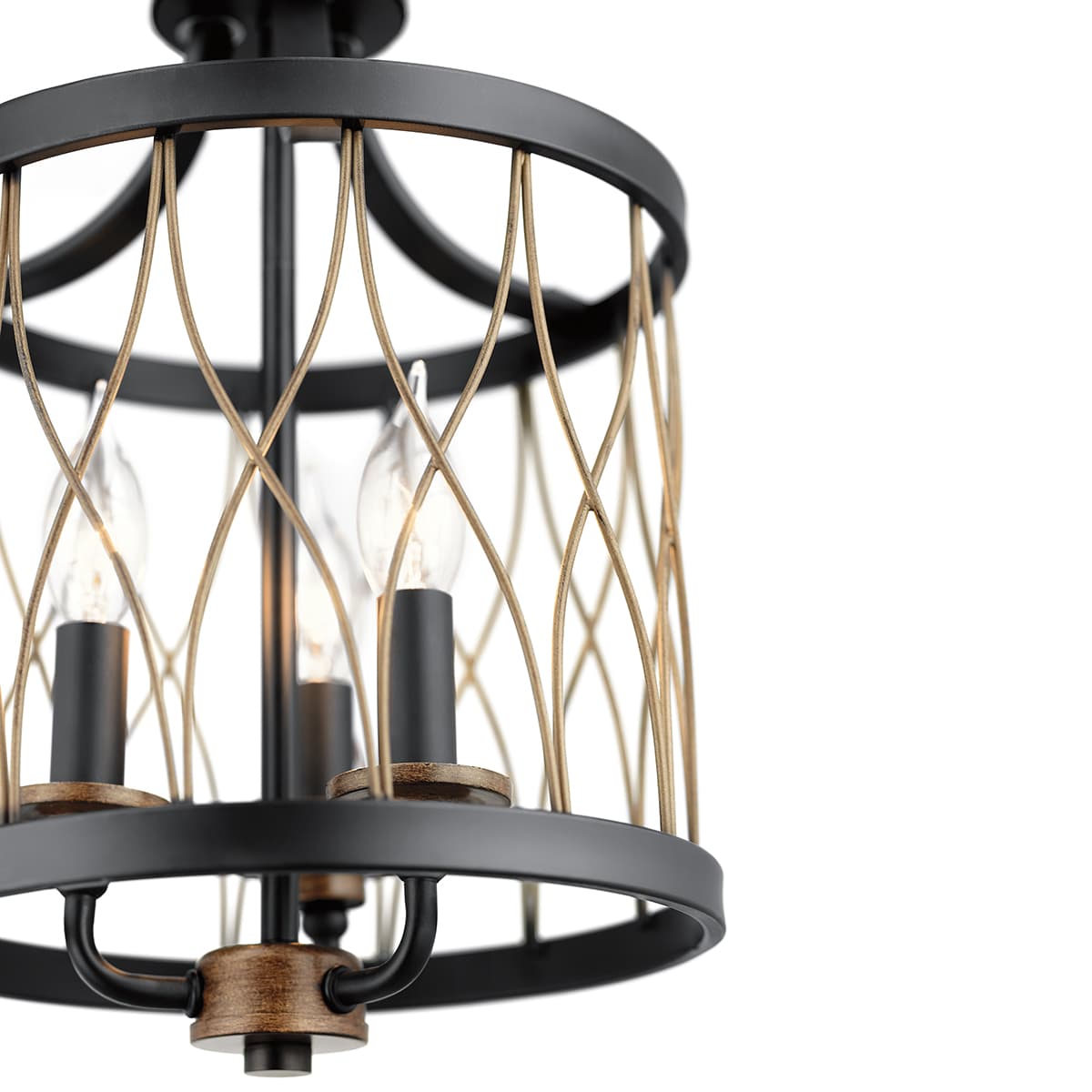 A French country-inspired drum pendant in black with gold-tone detailing, the Kichler Brookglen adds vintage charm and warm illumination. Its candelabra-style bulbs sit within a round wire basket, and the fixture can convert to a semi-flush mount for flexible installation.