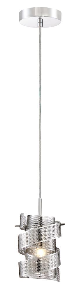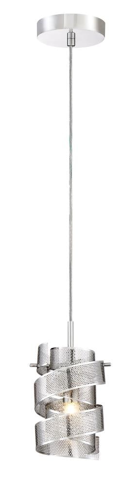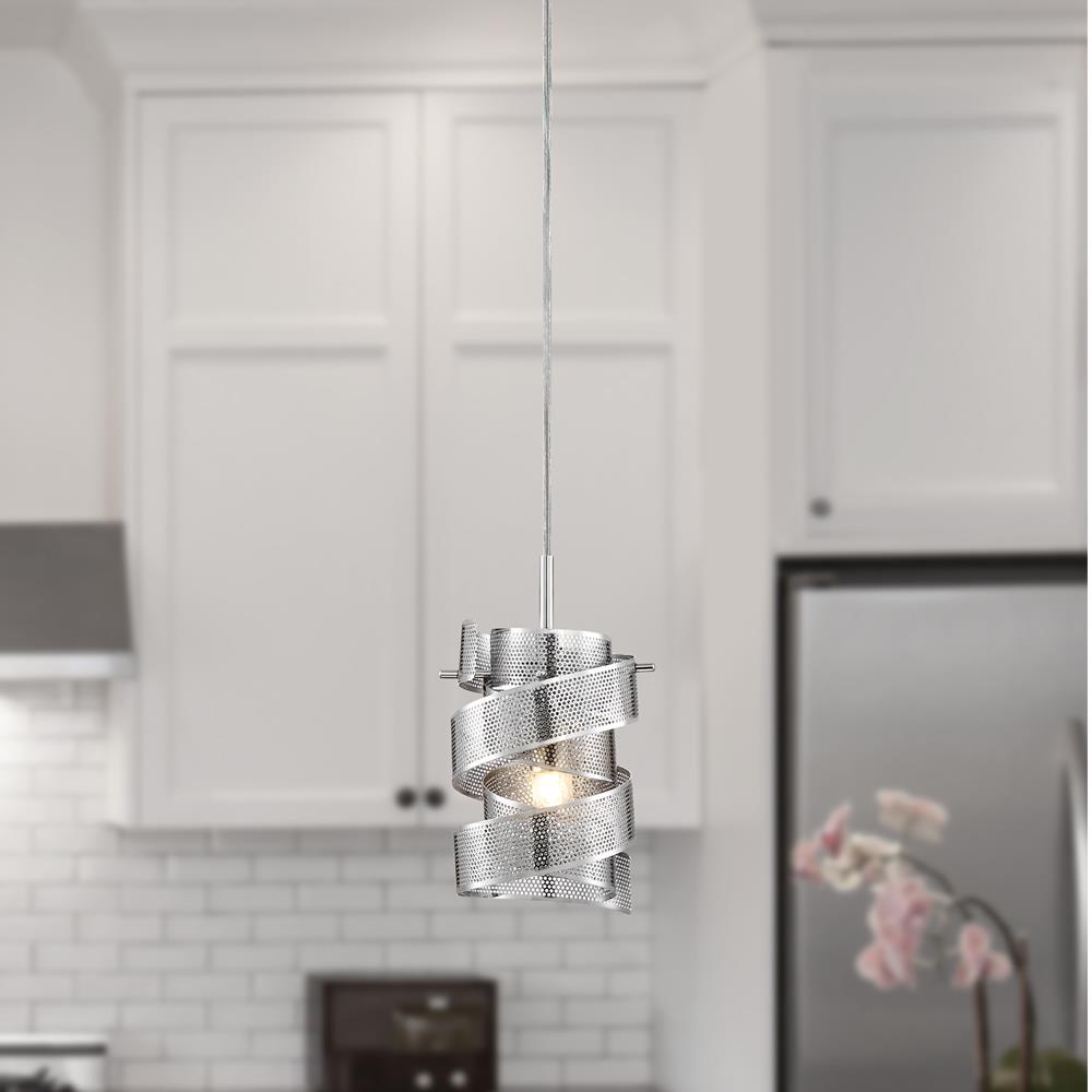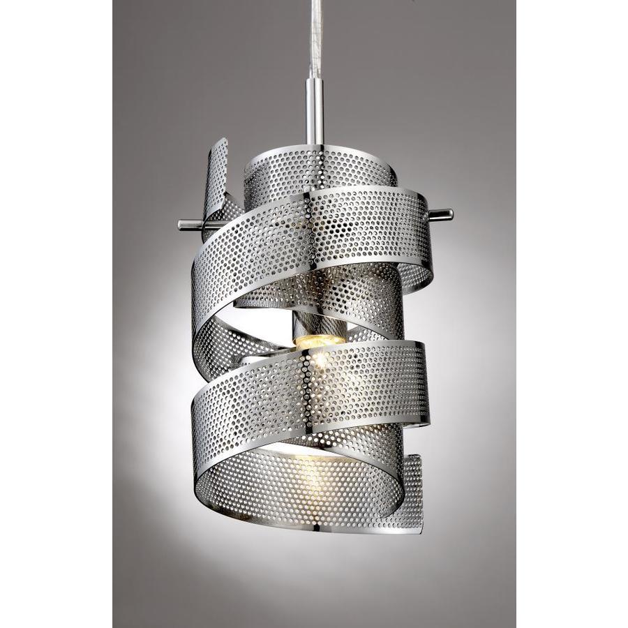 The Quoizel Lace mini pendant brings a sculptural swirl of perforated metal ribbons in a polished chrome finish to kitchens, islands, and hallways. This 1-light fixture includes a G9 bulb, offers adjustable hanging height, and is ETL listed for damp locations.
