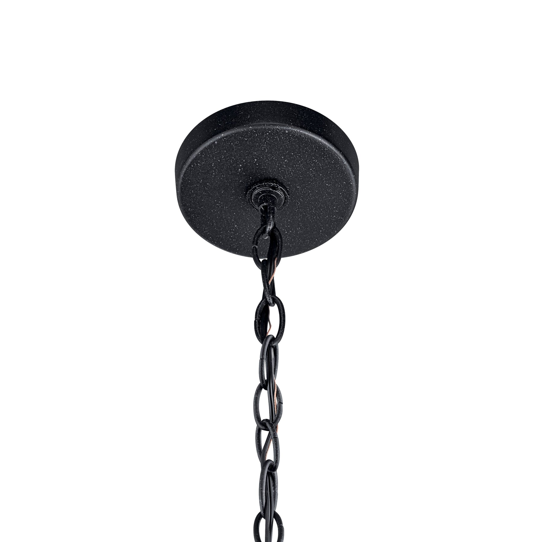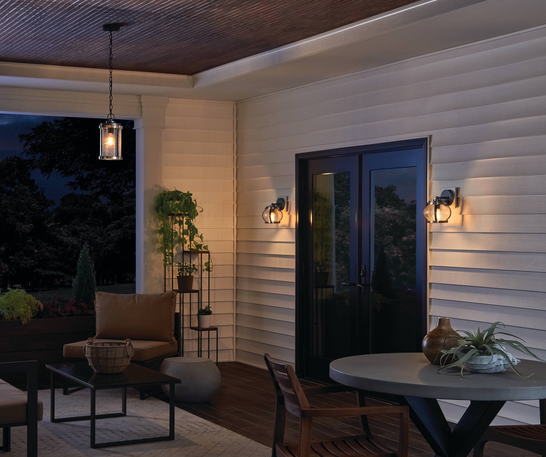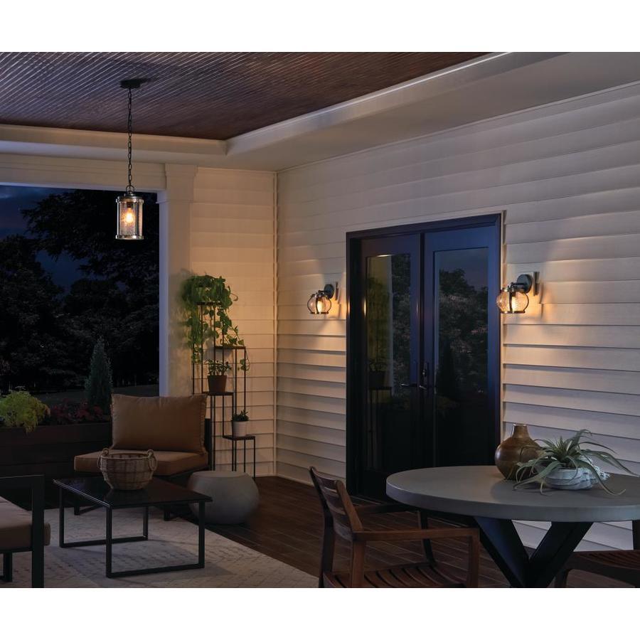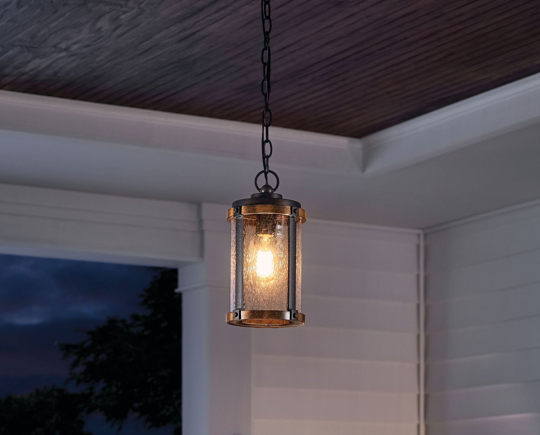 This Kichler Barrington outdoor pendant blends distressed black metal with aged wood accents and clear seeded glass for a rustic yet refined look. Adjustable chain offers versatile hanging heights, and the damp-rated fixture is ideal for covered porches and patios.