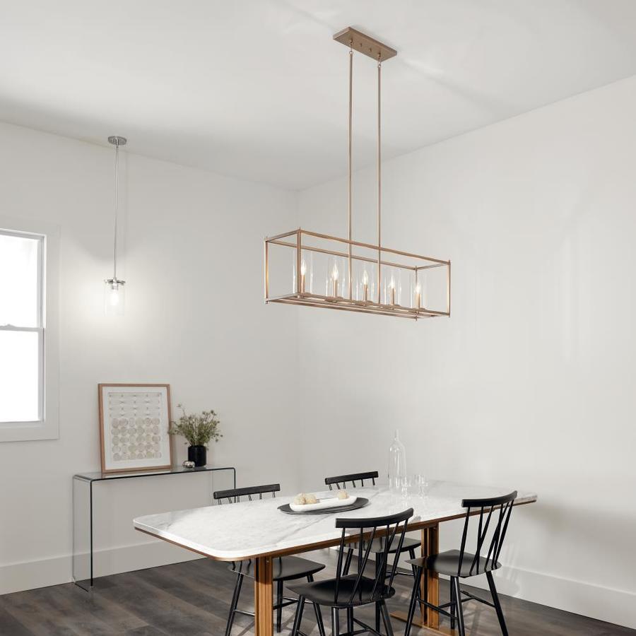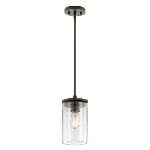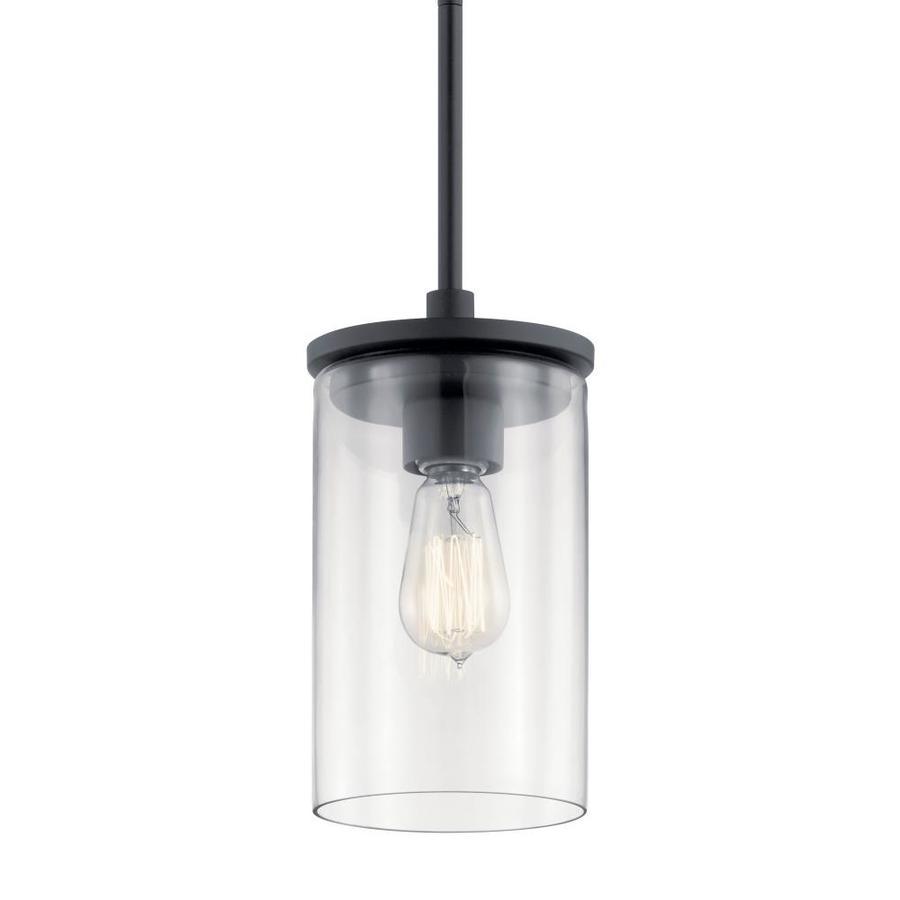 The Kichler Crosby mini pendant pairs a sleek Chrome finish with a clear glass cylinder for crisp, contemporary illumination. Sized at 10.75 inches high by 6 inches in diameter, it uses a single medium-base bulb up to 100W and is ideal over islands, sinks, or in multiples.
