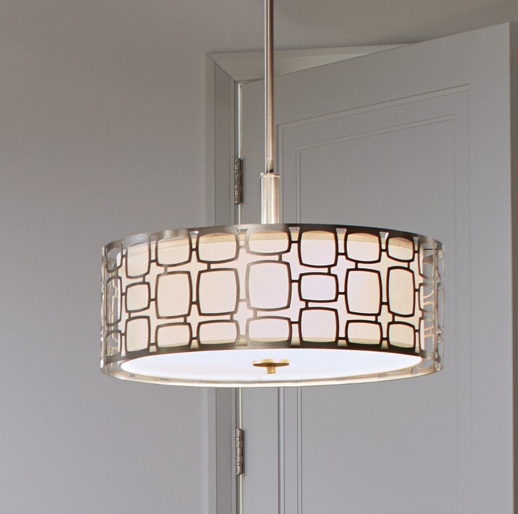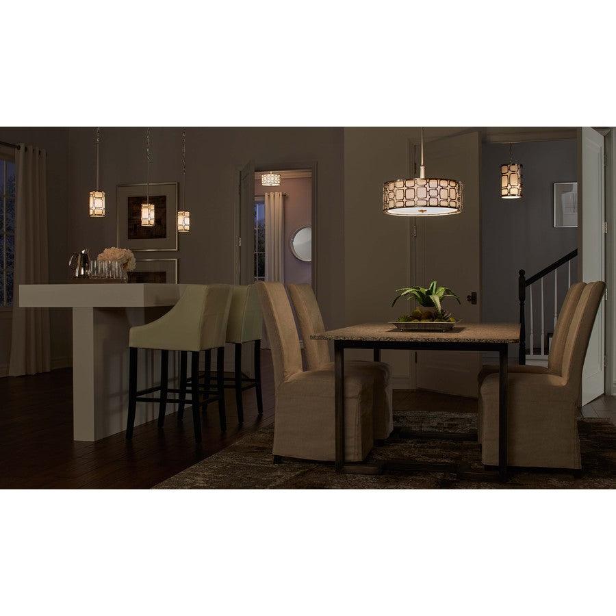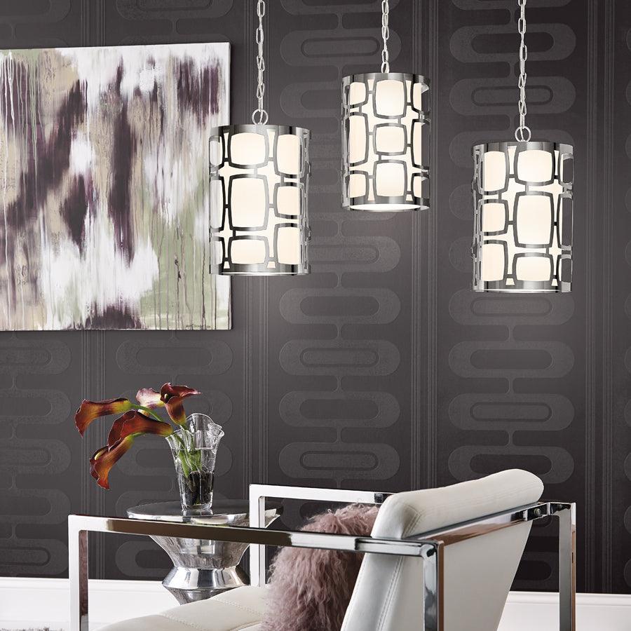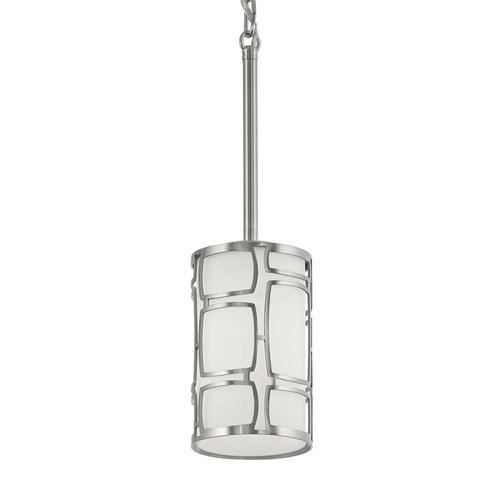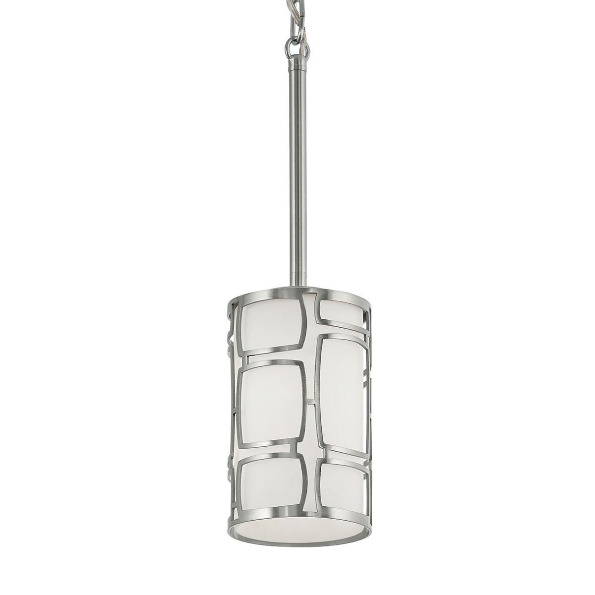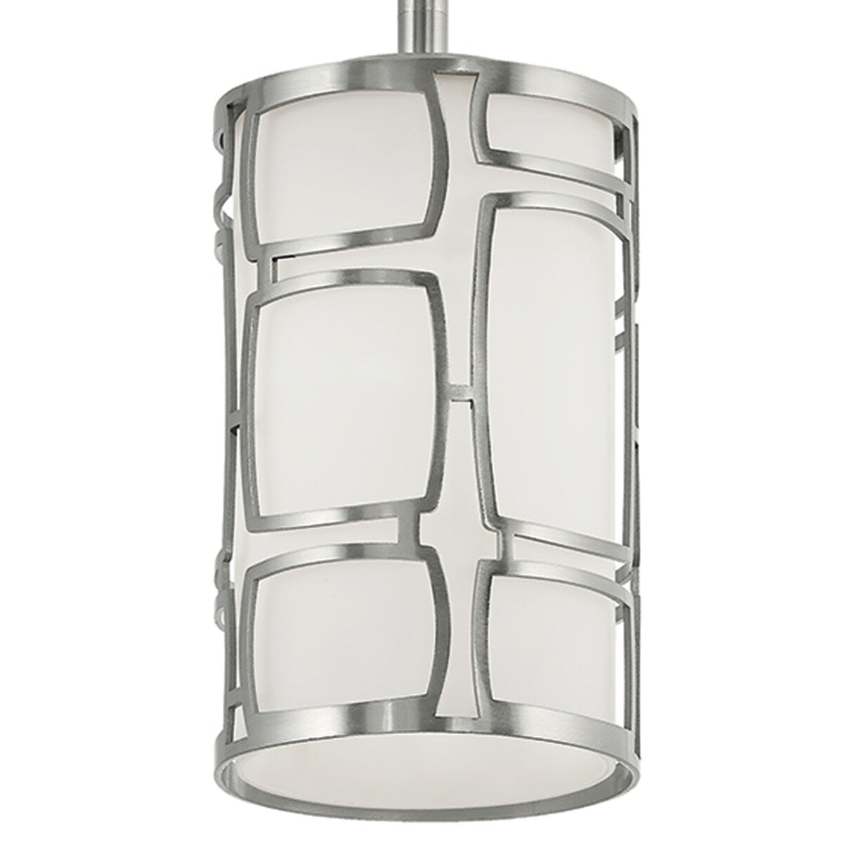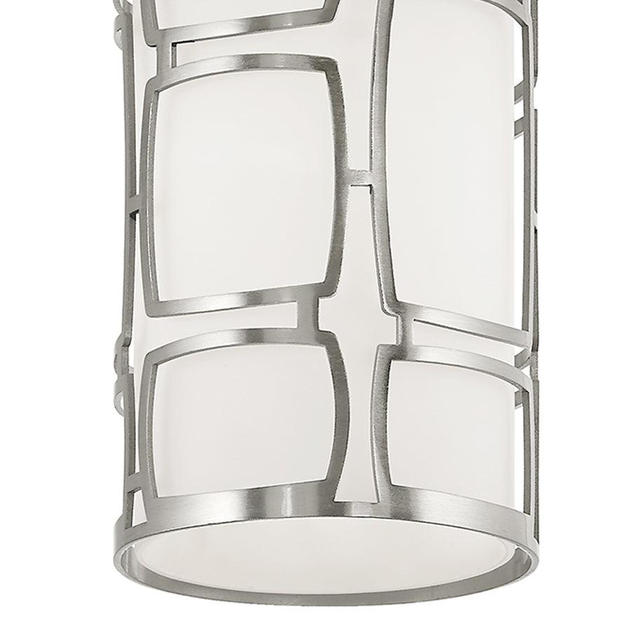 The Kichler Sabine mini pendant pairs a brushed nickel geometric metal cage with an etched opal glass cylinder for a crisp, modern look. Adjustable downrod/chain suspension and dimmable, medium-base bulb compatibility make it a versatile choice over islands, bars, or in multiples.
