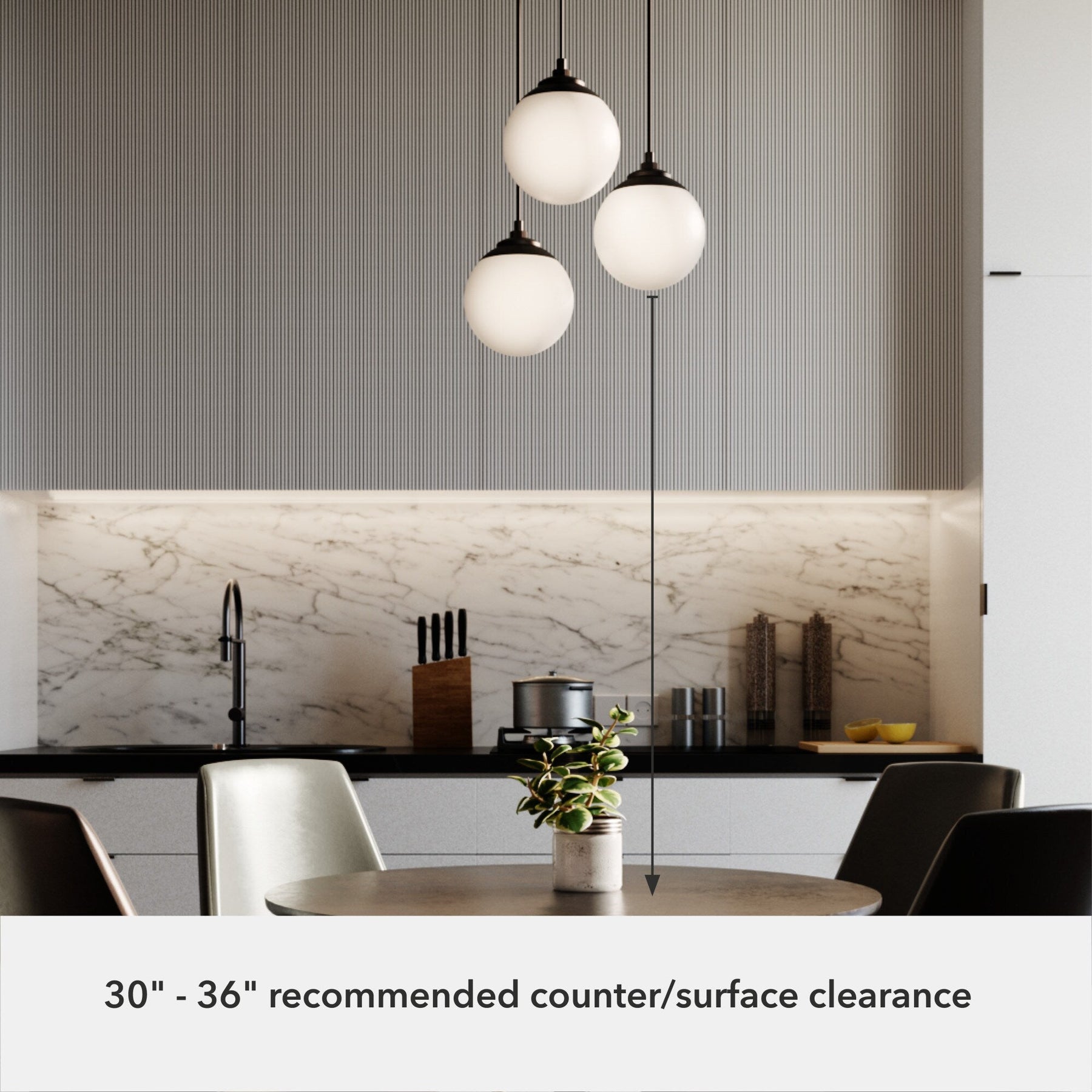 Illuminate your space with the elegant Hepburn 3-Light Matte Black Pendant from Hunter. This mid-century modern fixture features stylish globe-shaped cased white glass shades that reflect a luxurious 1920's aesthetic. Perfect for adding a touch of sophistication to kitchens, dining areas, or living rooms, this pendant blends classic design with modern functionality.