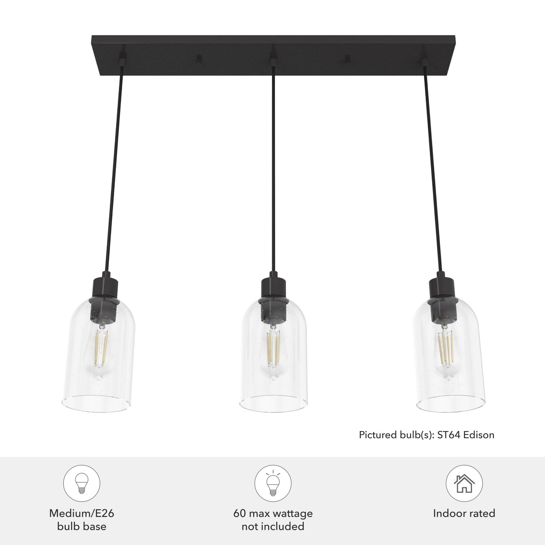 A: The Hunter Lochemeade requires three E26-base light bulbs, each with a maximum of 60 watts, or LED equivalents.
